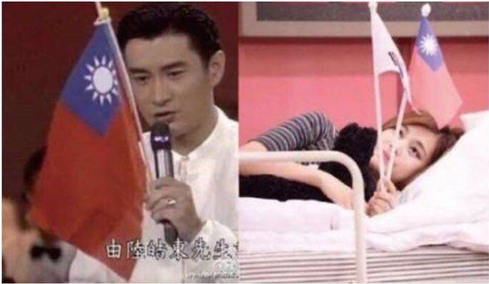 In January, Tzuyu of Korean girl group TWICE appeared on a variety show called "My Little Television." The crew gave her and her group flags to represent where they were from. Some members were holding South Korean flags, some held Japanese flags, and Tzuyu held a Taiwanese flag. She was born and raised in Taiwan. It would make sense for her to wave that flag, yes?