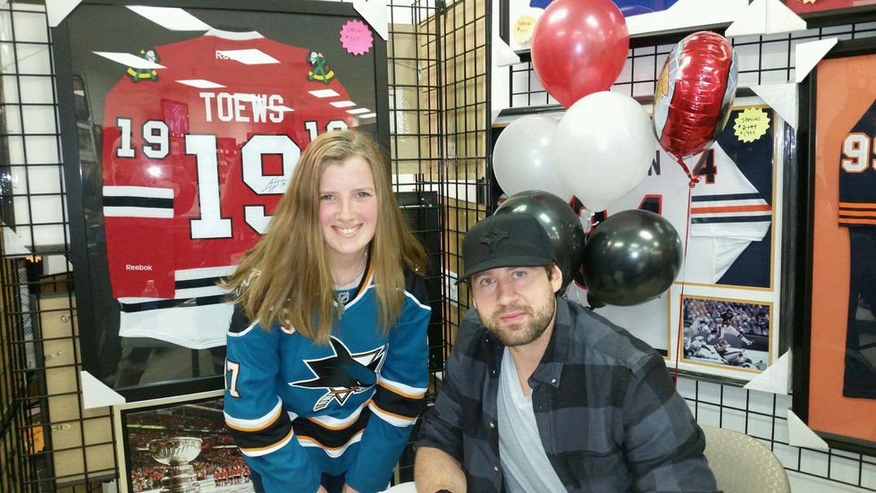 As the years went by, life got hectic for me personally, but I still found time to watch him play on the Sharks. That was until he got sent down to the Worcester Sharks, then got loaned to the Chicago Wolves in January of 2015. In February, the 4th, to be exact, he had a signing in Buffalo Grove. I knew it was my chance to tell him how he was my favorite player, but when I got to the place (thanks to my mom), all I could say was a "Hi my name is Delia." He was so sweet and that's where this picture comes into play.
