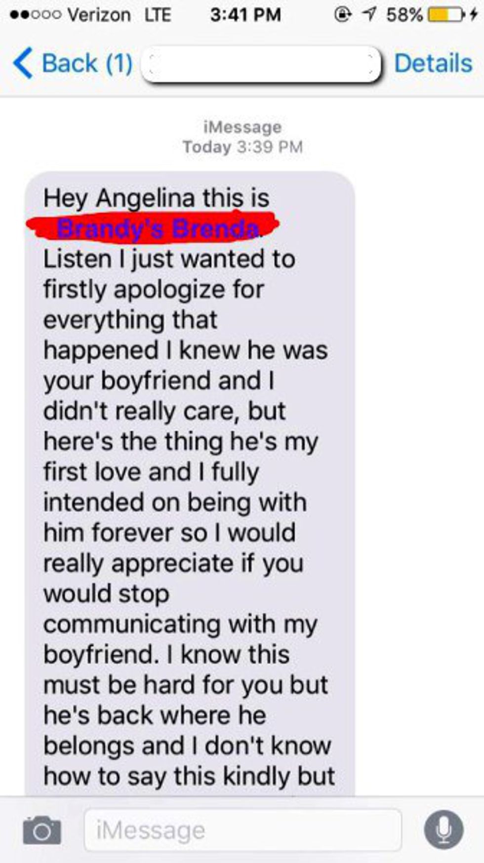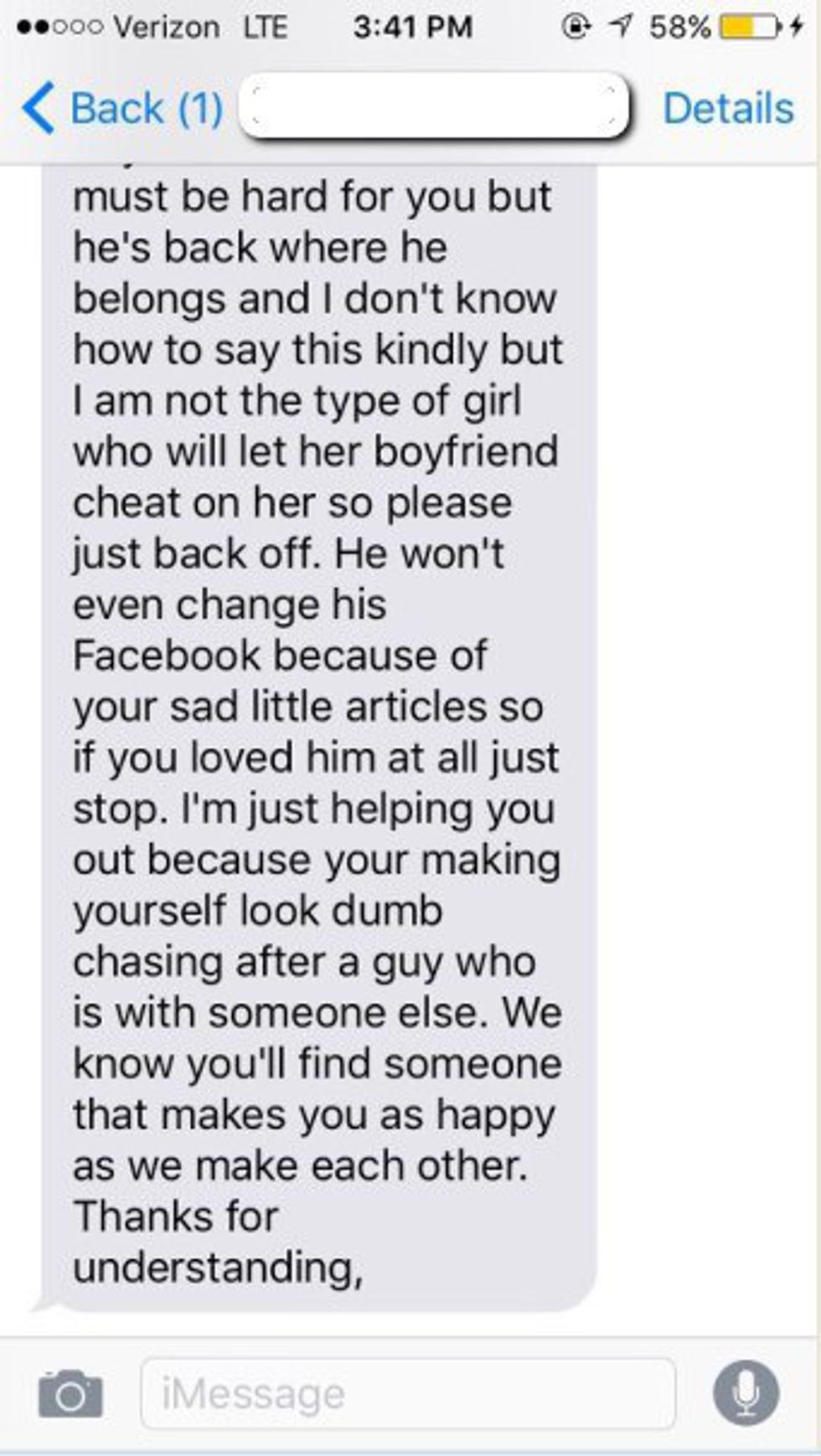 I'm sorry it took me a few days to write this response. I was just trying to calculate who the f**k you think you're talking to, but hey, congratulations, you have won the ultimate prize: a low-life loser who cheats, lies and will manipulate your love and trust! I really hope the two of you are happy together because awful people seem to belong together! Oh, and thanks for the sweet apology! I want you to say you have nothing to worry about because, while you might sleep with someone knowing he is with another girl, that's not me. Unlike you, I have some self-respect.