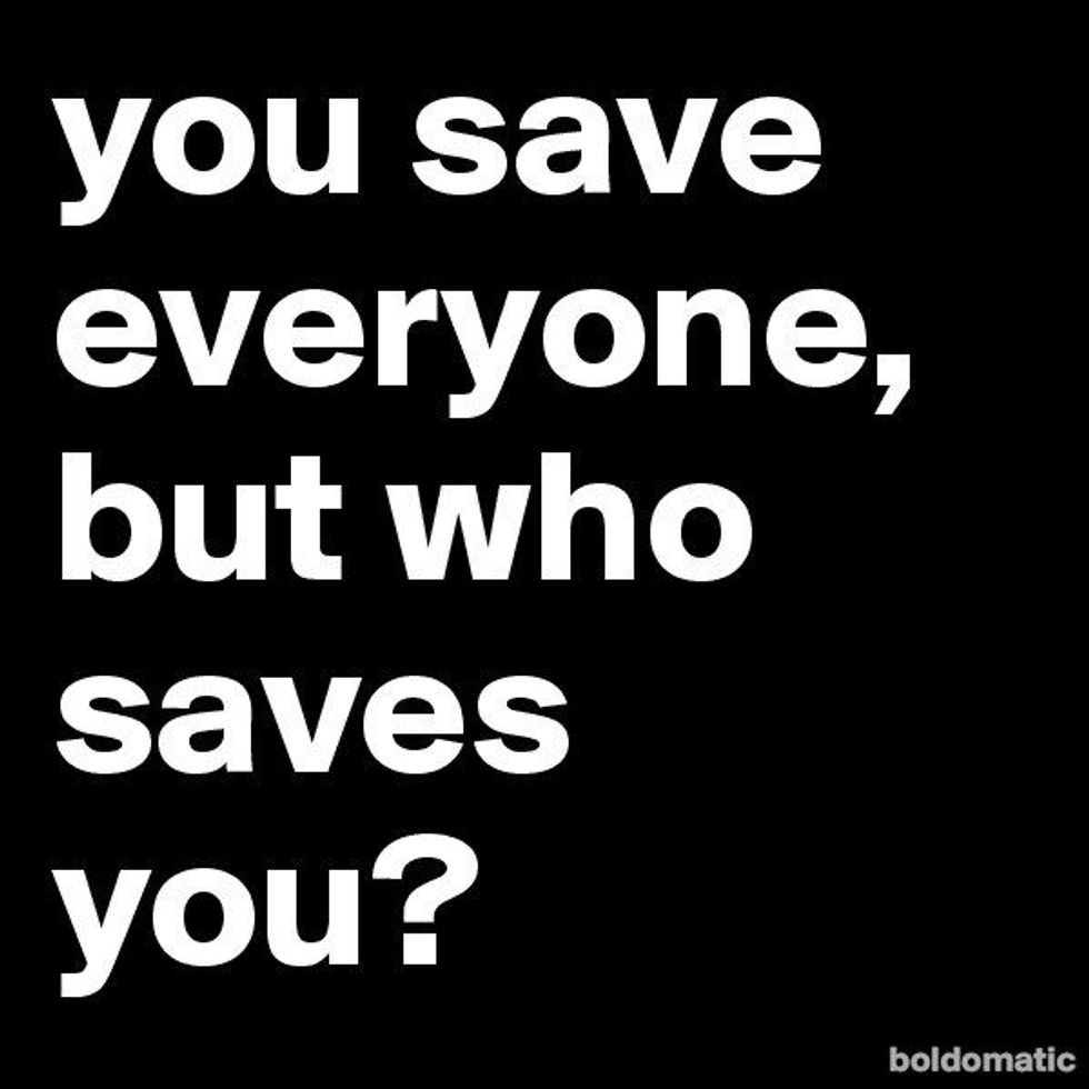 I know now that I can't save everyone. You can only hope you've given them the tools to emerge from situations in one piece. So I am going to take this time to save myself. Though my "help everyone" gene is strong, I am stronger. And I know you're strong, too.