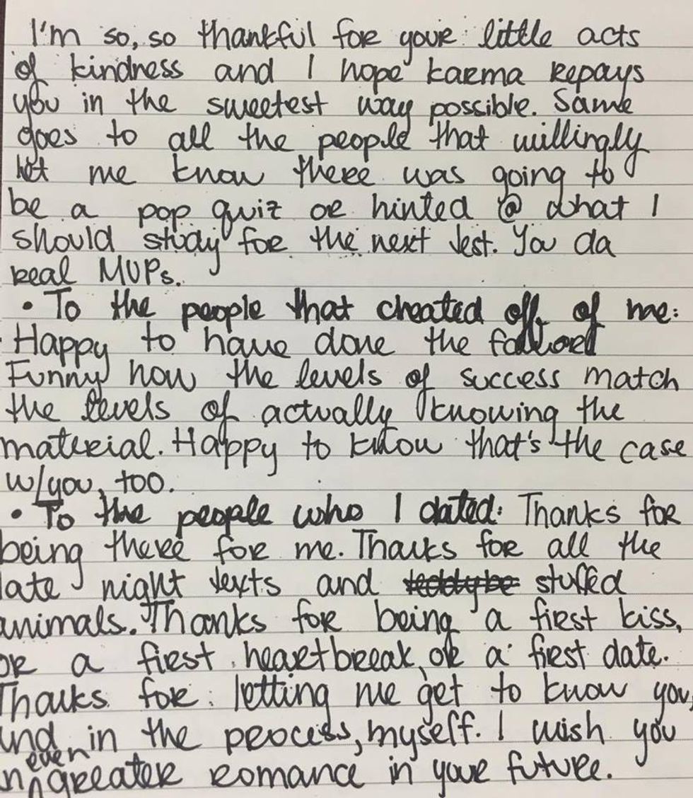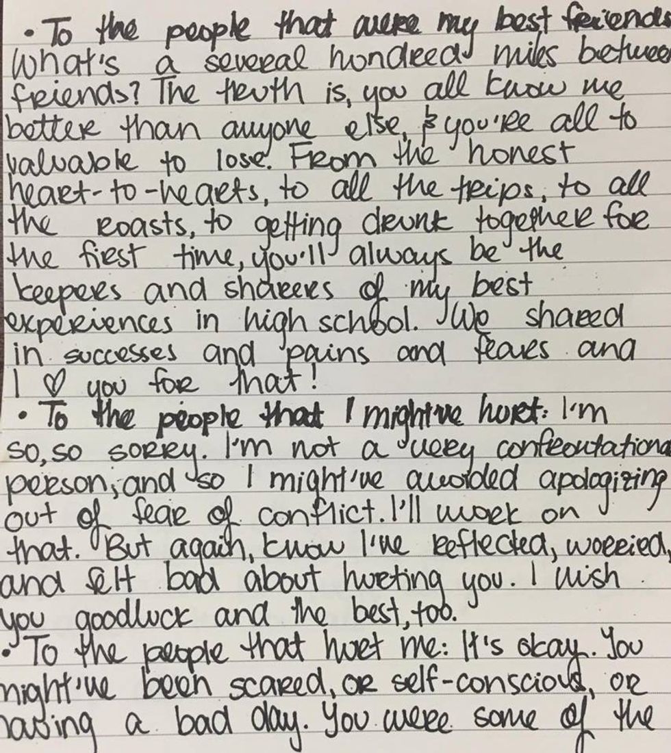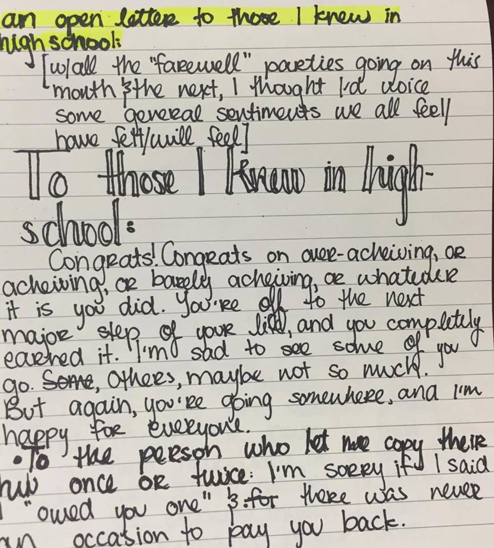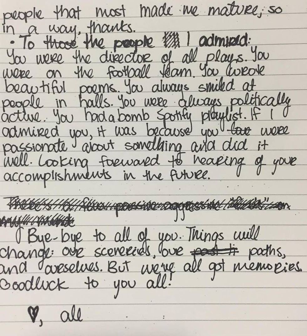 You were the director of all the plays. You were on the football team. You wrote beautiful poems. You always smiled at people in the halls. You were always politically active. You had a bomb Spotify playlist. If I admired you, it was because you were passionate about something about something that you did, and did it well. I'm looking forward to hearing about your next accomplishments.