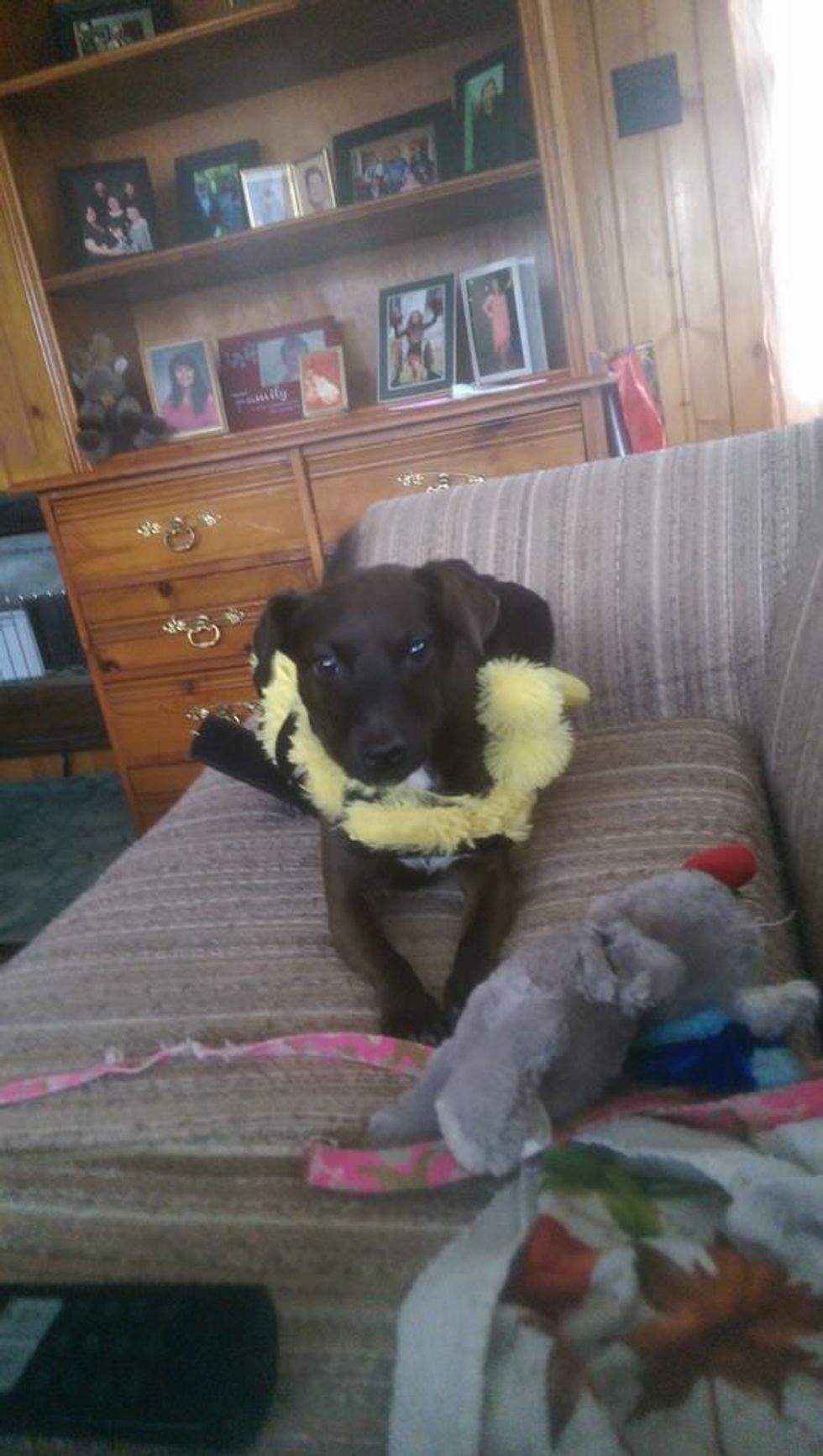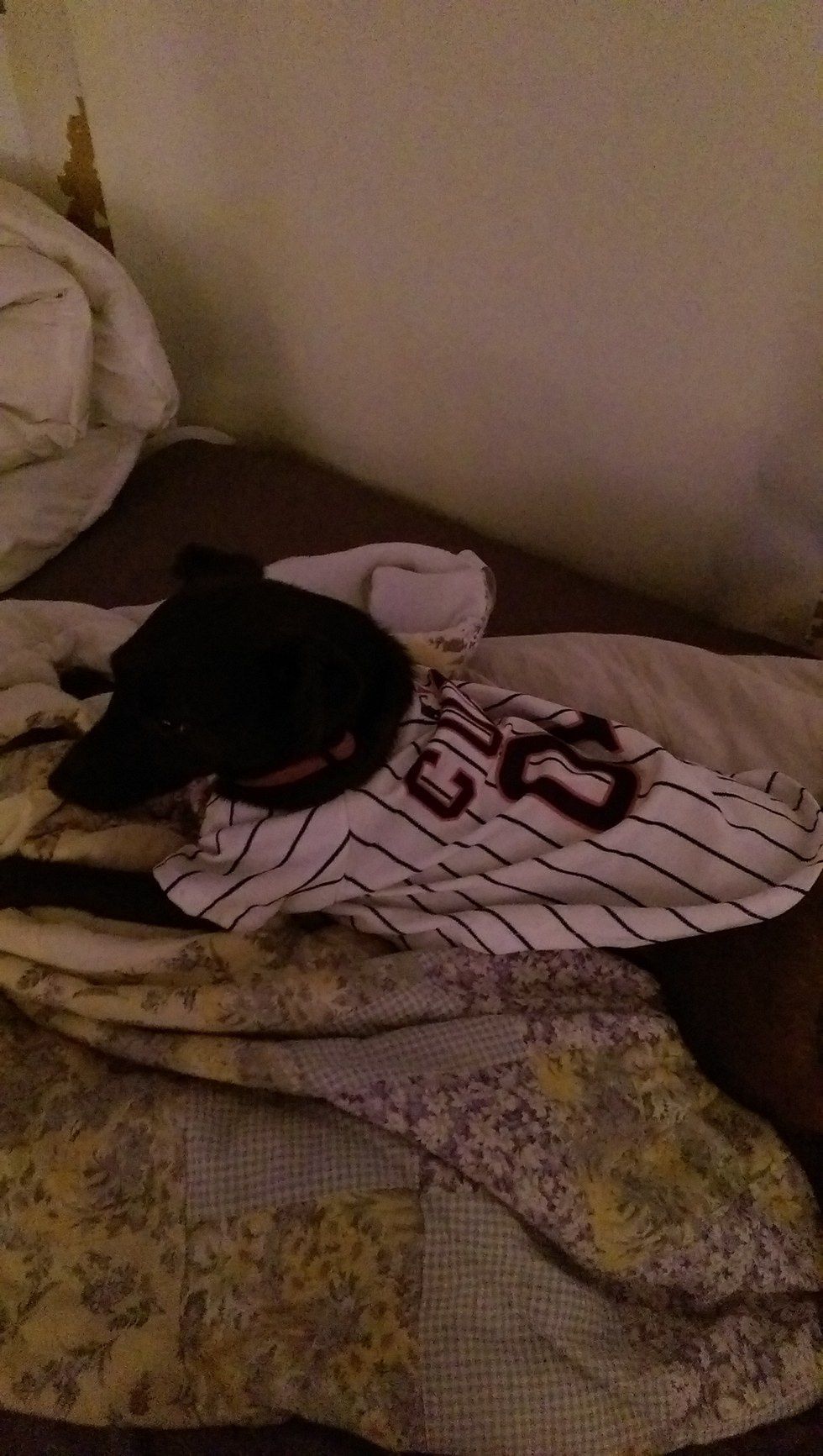 Above are pictures of my dog Wrigley in her Cubs jersey and as a bumblebee.