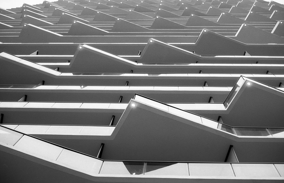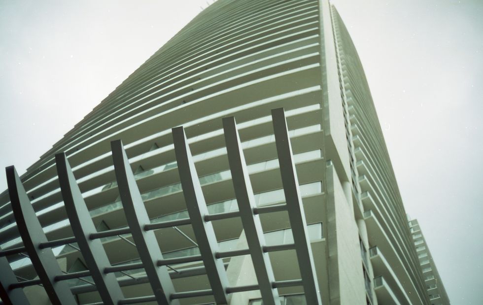 This shot was taken with one of the two rolls of black and white film that I took with me - Tmax 100 and Ilford HP5. I love black and white for architecture. This perspective was me standing right underneath a skyscraper looking straight up.