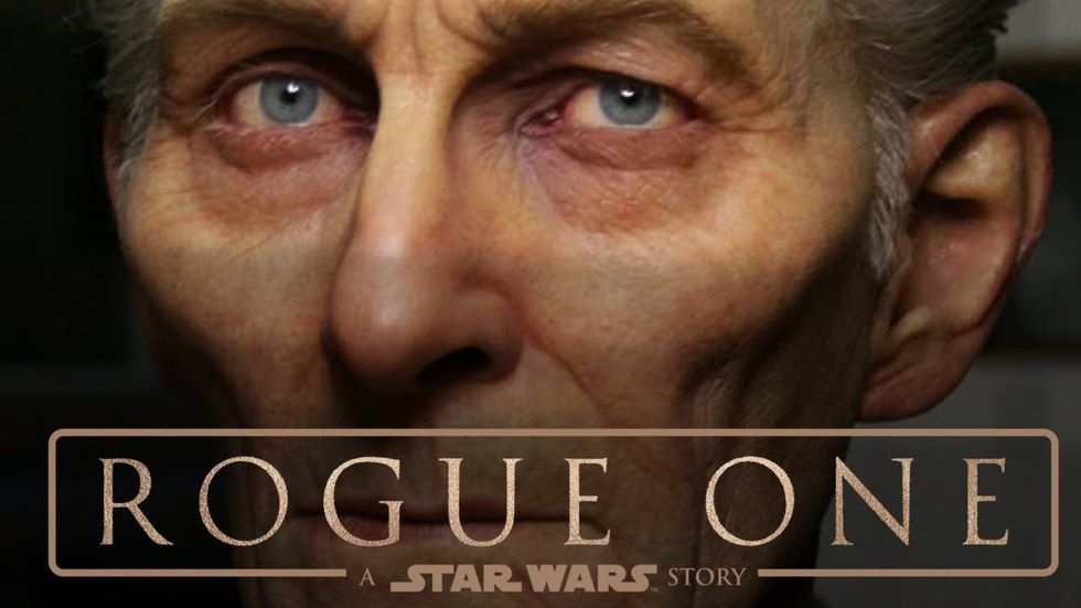 Darth Vader is the easiest to recreate with the greatest verisimilitude, since any bodybuilder can wear the suit and James Earl Jones is (thankfully) still with us and able to endow the Lord of the Sith with his iconic bass tones and gravitas regardless of his advanced age. Princess Leia/Carrie Fisher is also still alive, and actually reprised her role in 2015’s Star Wars VII: The Force Awakens. However, that movie takes place within the “proper” Star Wars chronology and continued moving forward in time, rather than taking an enormous non- chronological leap backward as is the case with Rogue One. To simplify the point, it makes much more sense for the filmmakers, logistically, for Carrie Fisher to be playing Leia in her late fifties to early sixties than it would be to try and make her look forty years younger in order to play the role of Princess Leia as she appeared in first film of the series. Then there’s Admiral Tarkin, played by the late, great Peter Cushing, who passed away in 1990. In both of the latter cases, director Gareth Edwards and his team decided that in order to have something that resembled 1977 versions of Carrie Fisher and Peter Cushing in their movie, they would turn to computer generated imagery…which doesn’t work at all. Even in a galaxy far, far away, there’s no escaping the uncanny valley. The image below is the best I could find of Tarkin in the film, and even it fails to capture just how creepy and unrealistic this digital copy of the Grand Moff is: just try and imagine this cartoon character moving, speaking and reacting to the actions of real, flesh and blood actors as if it's also a real person.