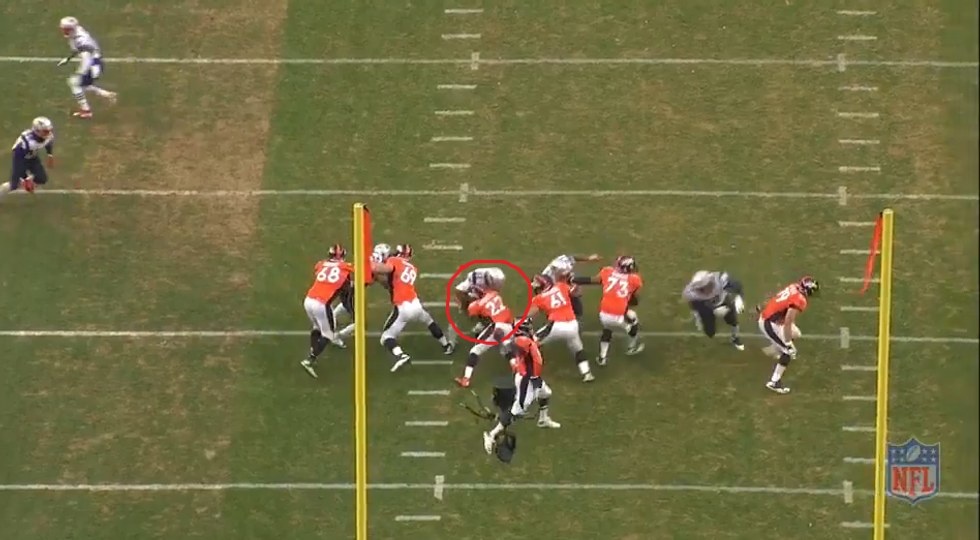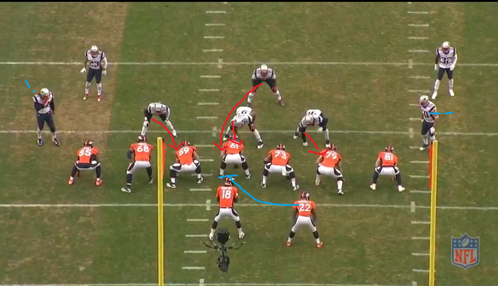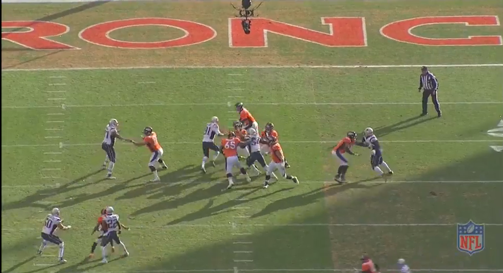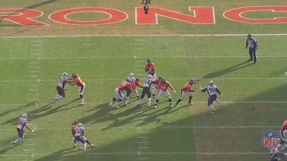 The situation is second down and 10 from Denver's own 20 yard line. It is likely going to be a pass so New England calls a 4 man blitz which results in sack. One key to look at here is the distance between the ball and the linebackers, it is roughly a 5 yard difference. If the blitz is going to succeed then two things need to happen. One if Collins does not have free lane then he must quickly win his math cup and get to the QB. Two, there cannot be any short throws that neutralize the blitz. Since the linebackers are lined up 5 yards away, they will need a little extra time than if they were lined up 1 yard off the ball obviously.