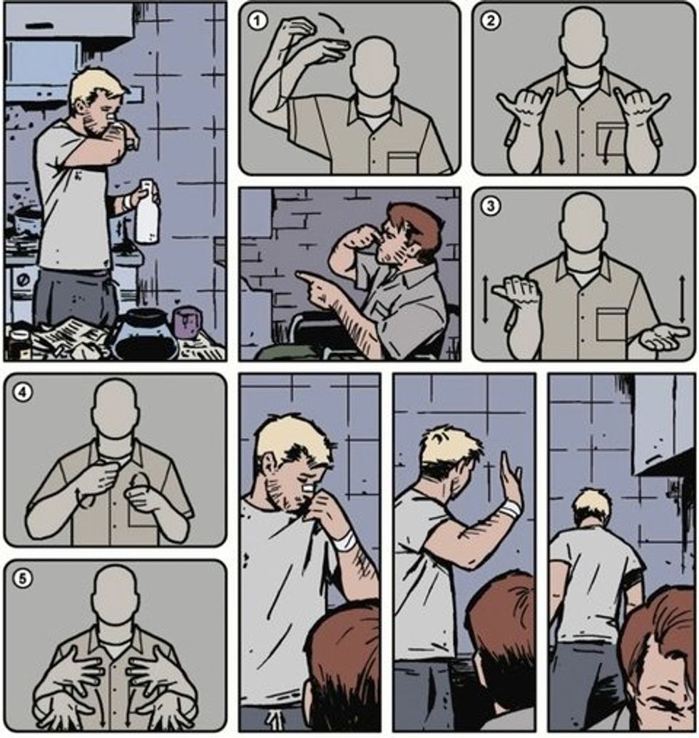 But “Hawkeye" issue No. 19 is a different kind of comic. Intent on conveying the frustration of deaf people, Fraction and Aja left speech bubbles blank and incorporated sign language into the comic, as shown in the image below. Leah Coleman reportedly loves the issue and its unique features, explaining, "Oh my gosh, that is exactly what it is like to be deaf. You know there are conversations going on and they may as well be empty speech bubbles on a page.’”