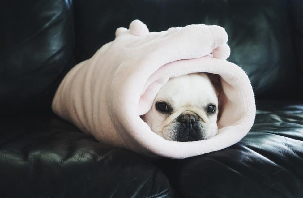 This little cutie is wrapped like a burrito! So comfy! This account features two lovable French bulldogs!