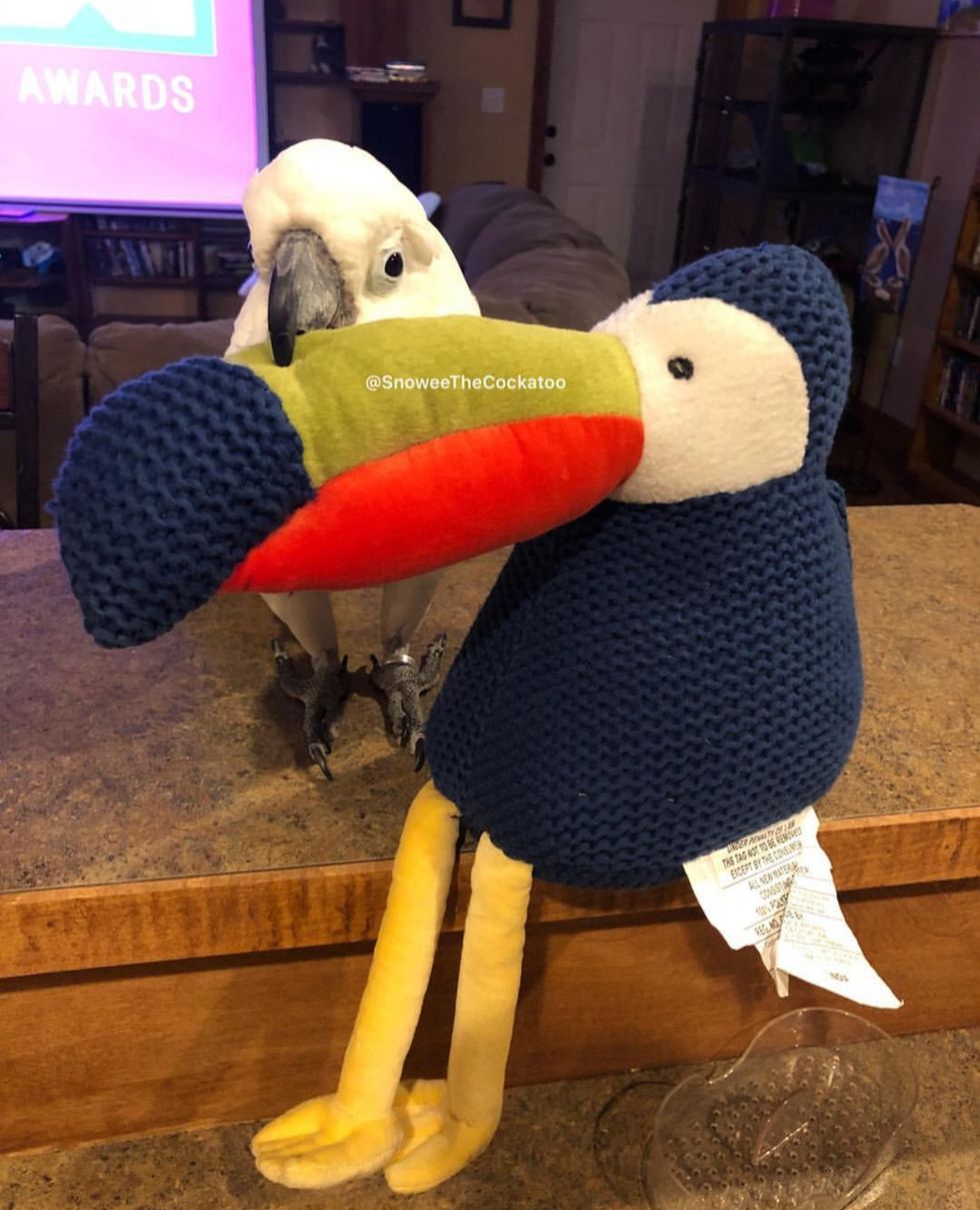 This umbrella Cockatoo doesn't know how to feel about her toucan toy. Snowee's Instagram shows herself and her family.