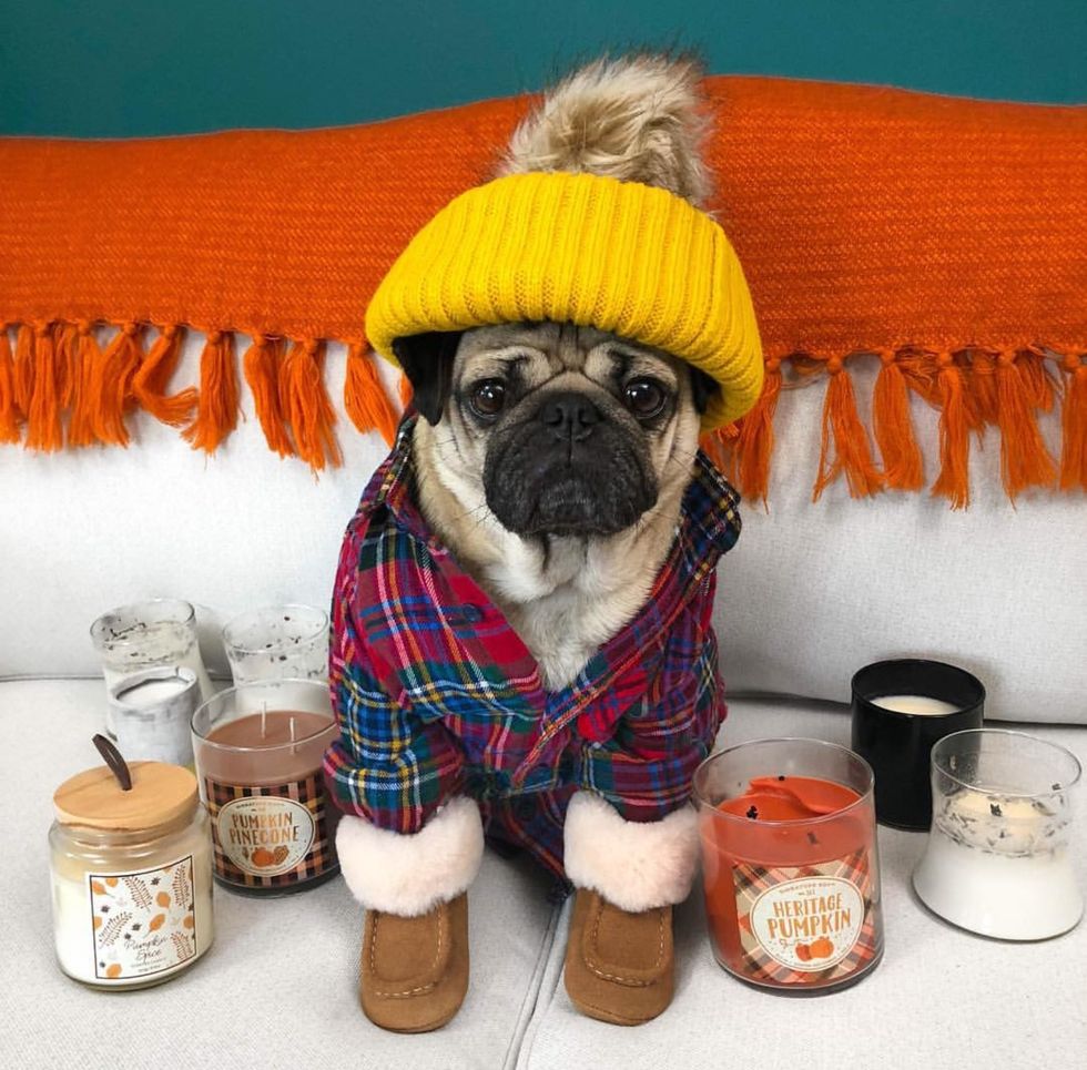 Doug looks like he's officially ready for fall!! Breaking out the candles and the flannels. Doug the pug has a well known Instagram featuring him living life to the fullest while being dressed to impress.