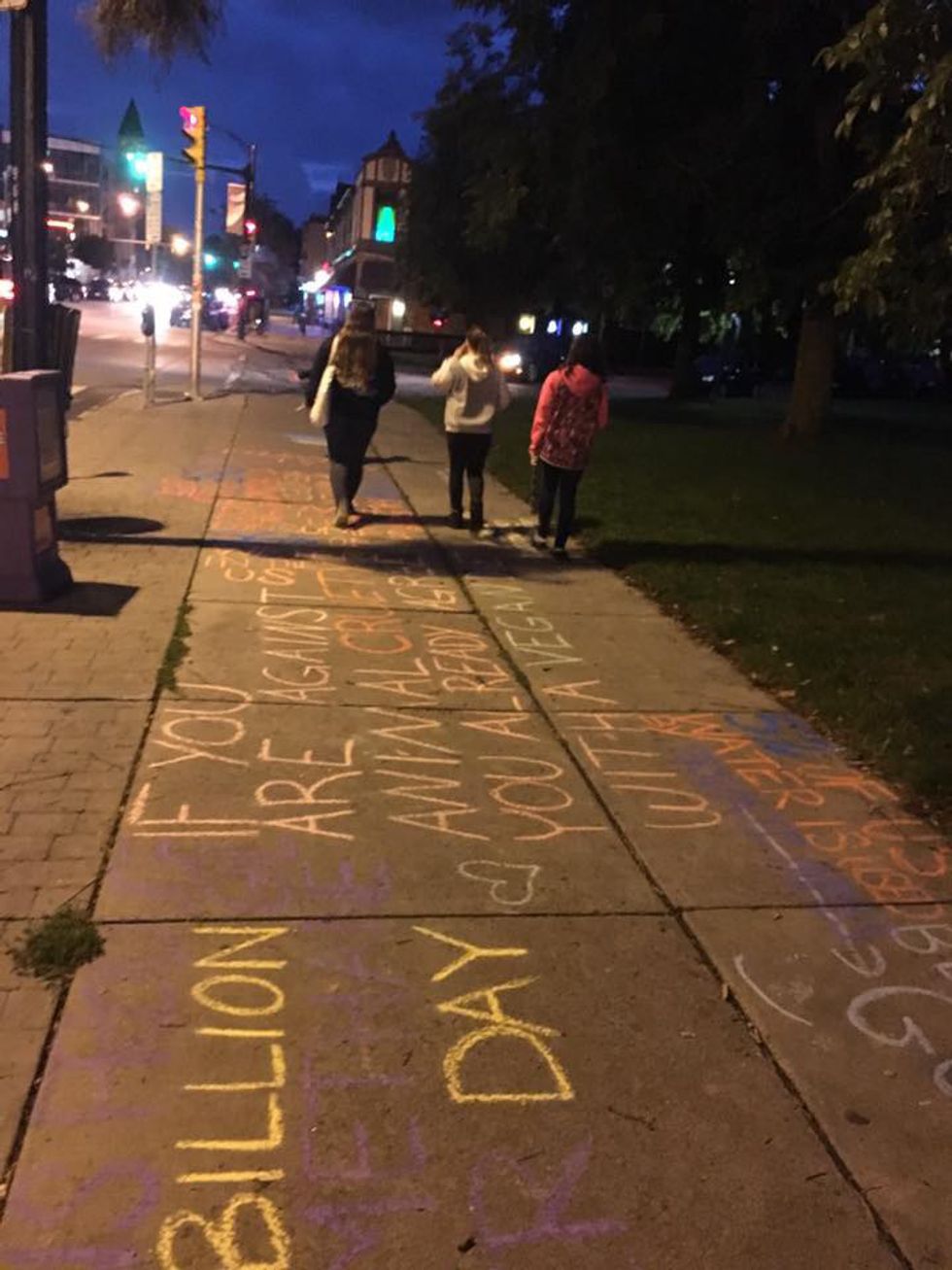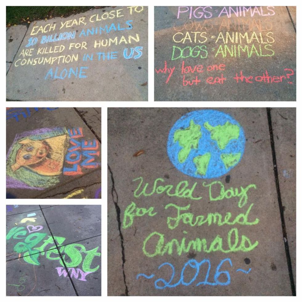 On Sunday, October 2, citizens of Buffalo came together for a vigil at Bidwell Park to honor the millions of animals slaughtered for food. The service was held during Farm Animal Rights Movements’s World Day for Farmed Animals, and their third annual #FastAgainstSlaughter. With chalk, the group covered the busy sidewalk with encouraging messages about veganism and facts about the meat and dairy industries. Some of these messages include, “Eat Your Ethics,” “Humane Meat Is a Myth,” and “US could feed 800 billion people with the grain livestock eat.” Afterwards, they lit candles and shared a moment of silence for the animals mistreated and killed in name of food. The vigil ended with optimistic reflections and hope for the future.