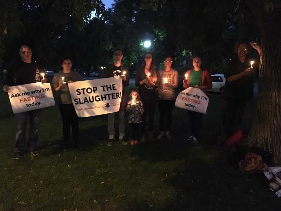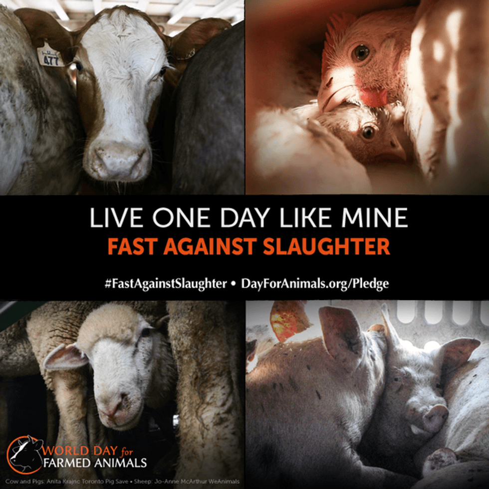 During #FastAgainstSlaughter, people are encouraged to abstain from food for a day to shed light on the mistreatment of animals in the food industry. It is an act of solitary and encourages self-reflection. Although fasting for a day is uncomfortable, it is nothing compared to the constant conditions of animals raised for slaughter. Chickens are frequently debeaked without anesthetic, and tossing live male chicks in a grinder is still common practice. Animals' tails and testicles are ripped off, and cows are artificially inseminated to produce milk, which involves inserting an entire arm into a cow’s vagina with a syringe. For their shortened lives, animals are either kept in cages so small they are unable to turn around, or packed in coops so crowded they step and defecate all over each other (and these are the cage-free chickens).