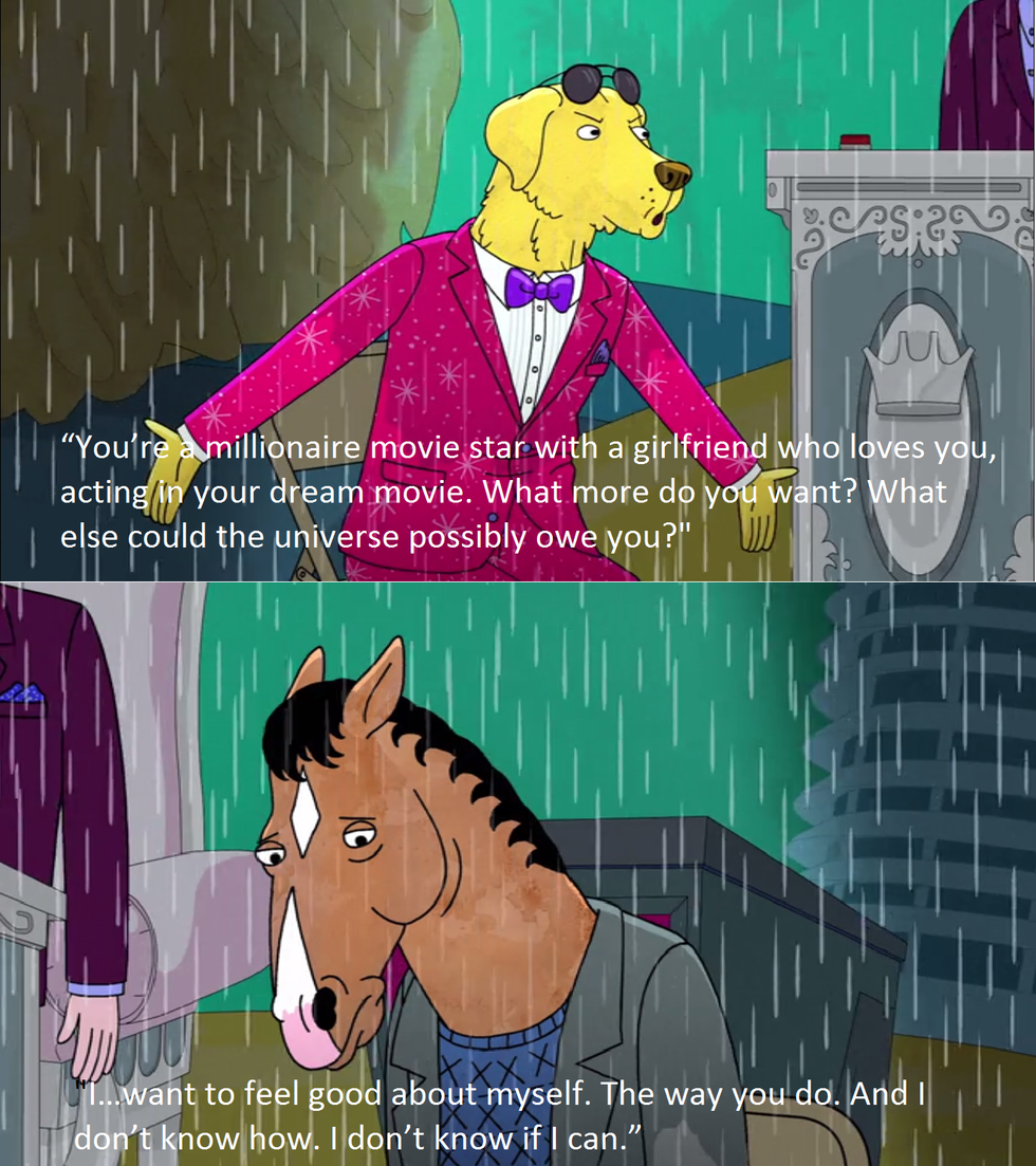 As Bob-Waksberg is showing, BoJack is incapable of magically feeling cured of depression, he is stuck in a cycle of misery that no amount of success will spontaneously whisk away. The only constant in the life of BoJack Horseman is depression, and without the necessary treatment, BoJack, regardless of success, failure, triumph, or misery, will remain in a state of depression.