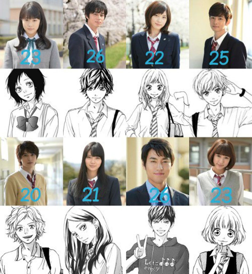 The main cast of Kimi Ni Todoke and Ao Haru Ride, and the comparisons between their manga, anime and live action versions, respectively.