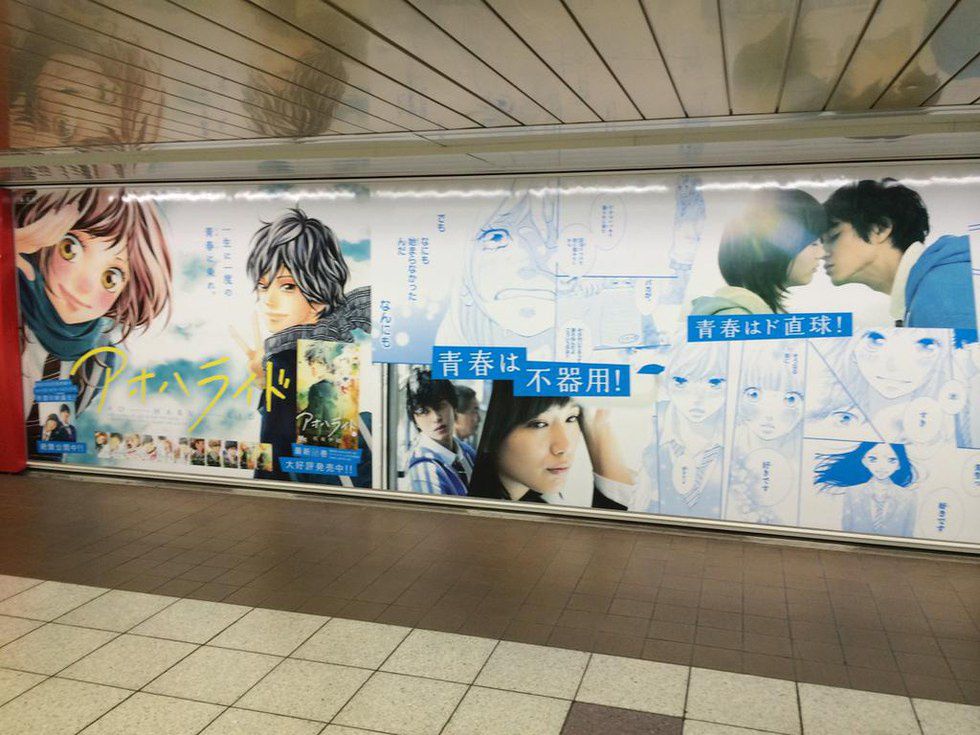 Ao Haru Ride live action movie advertisements on the walls of an underpass in Shinjuku Station, Tokyo.