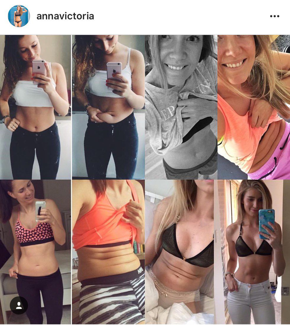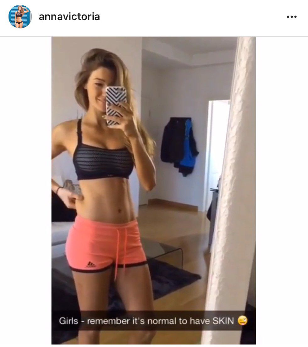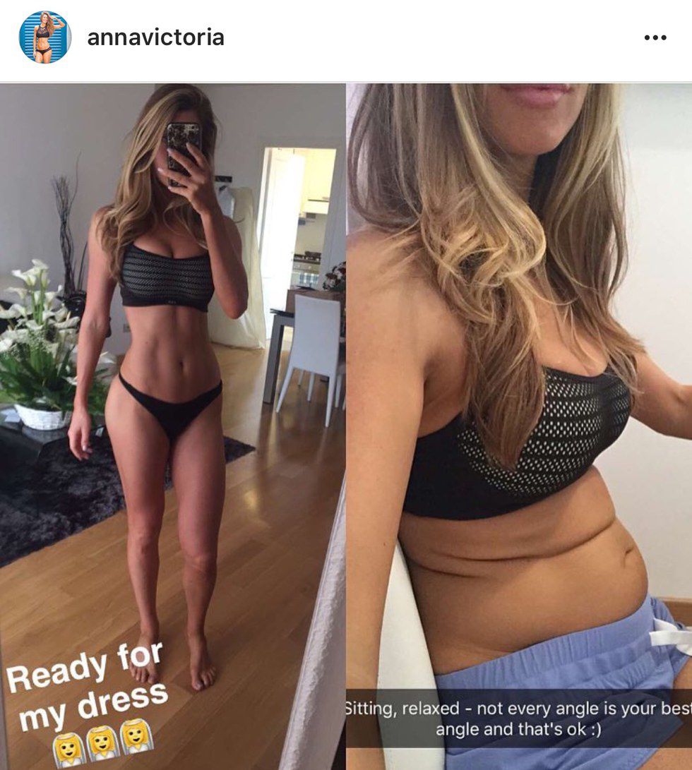 Anna Victoria, an Instagram fitness celebrity, recently started the trend of posting photos of her imperfect body. Not in such a way as complaining about her problem areas, but more to show everyone that no matter how great her body may look in certain photos, she too gets belly rolls when she sits down. The little areas that we obsess the most about, are in fact, areas that even the fittest people still have, because they're natural!