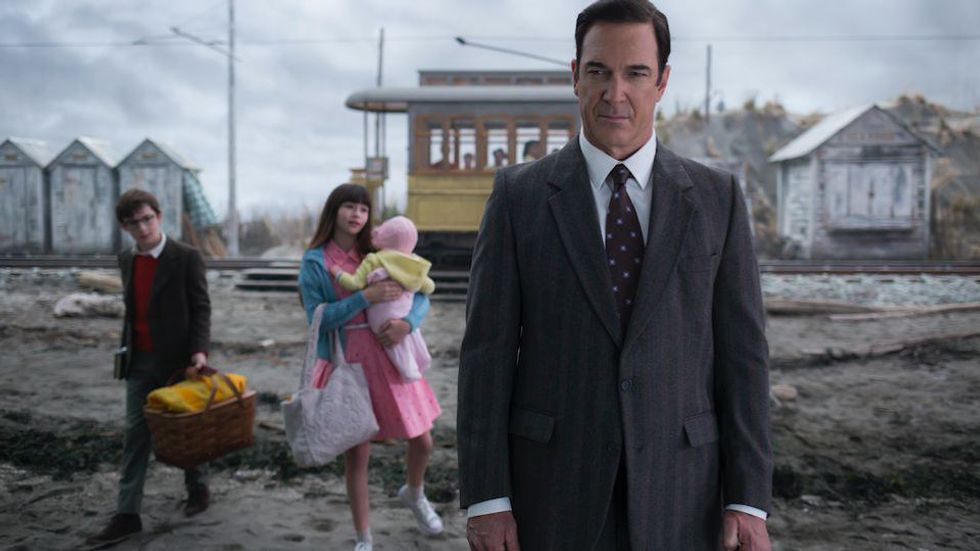 Three soon-to-be orphans are traveling on a rickety trolley to Briny Beach. Snicket utters, "I've never been through anything like this myself, but I can imagine exactly how you feel..."