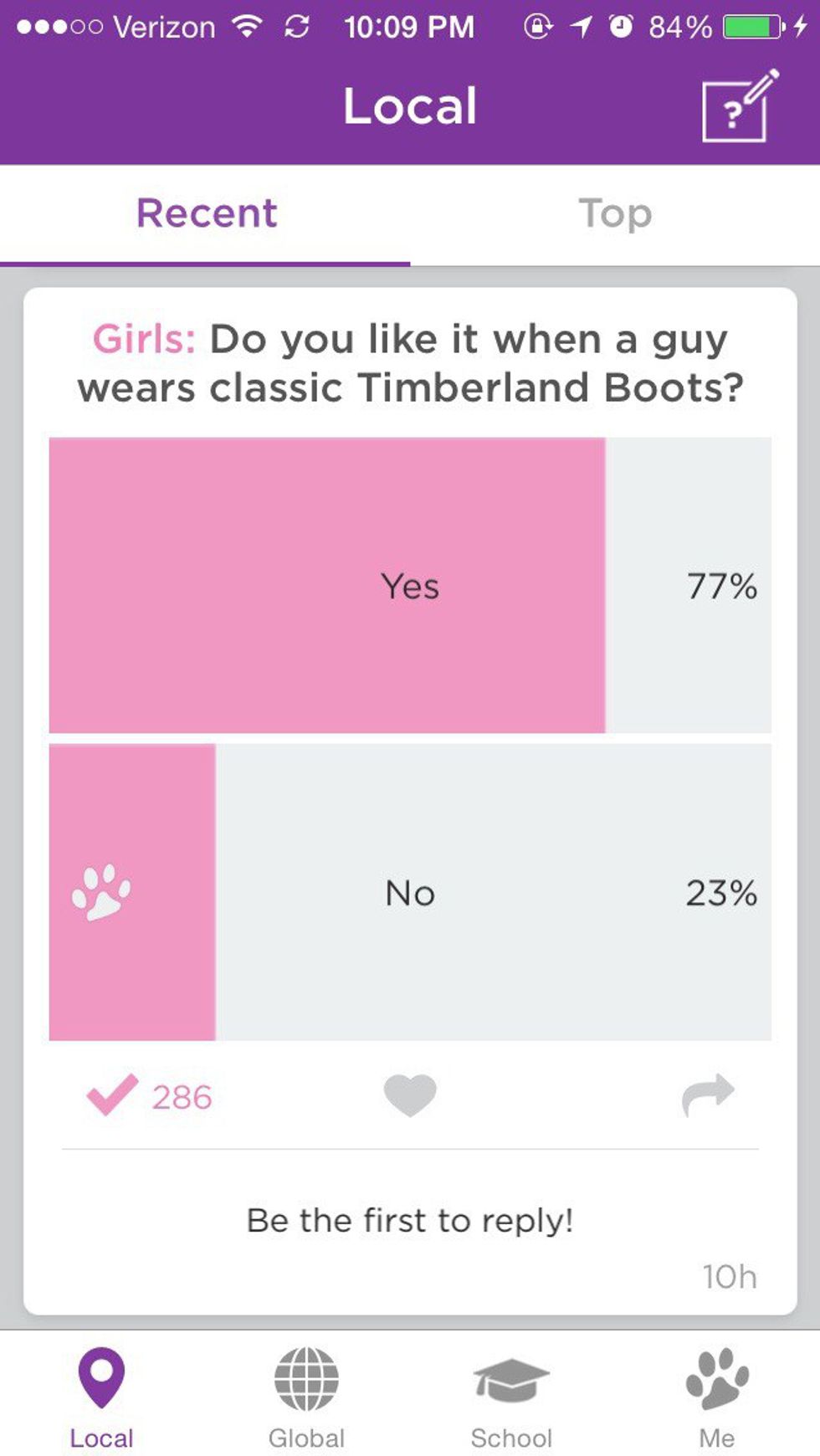 Gender specific polls are becoming increasingly popular throughout the Whatsgoodly platform, and sometimes it's humorous to see the answers. Sorry, I think Timberland boots are hideous, and the comment on the male's poll is worth a look.