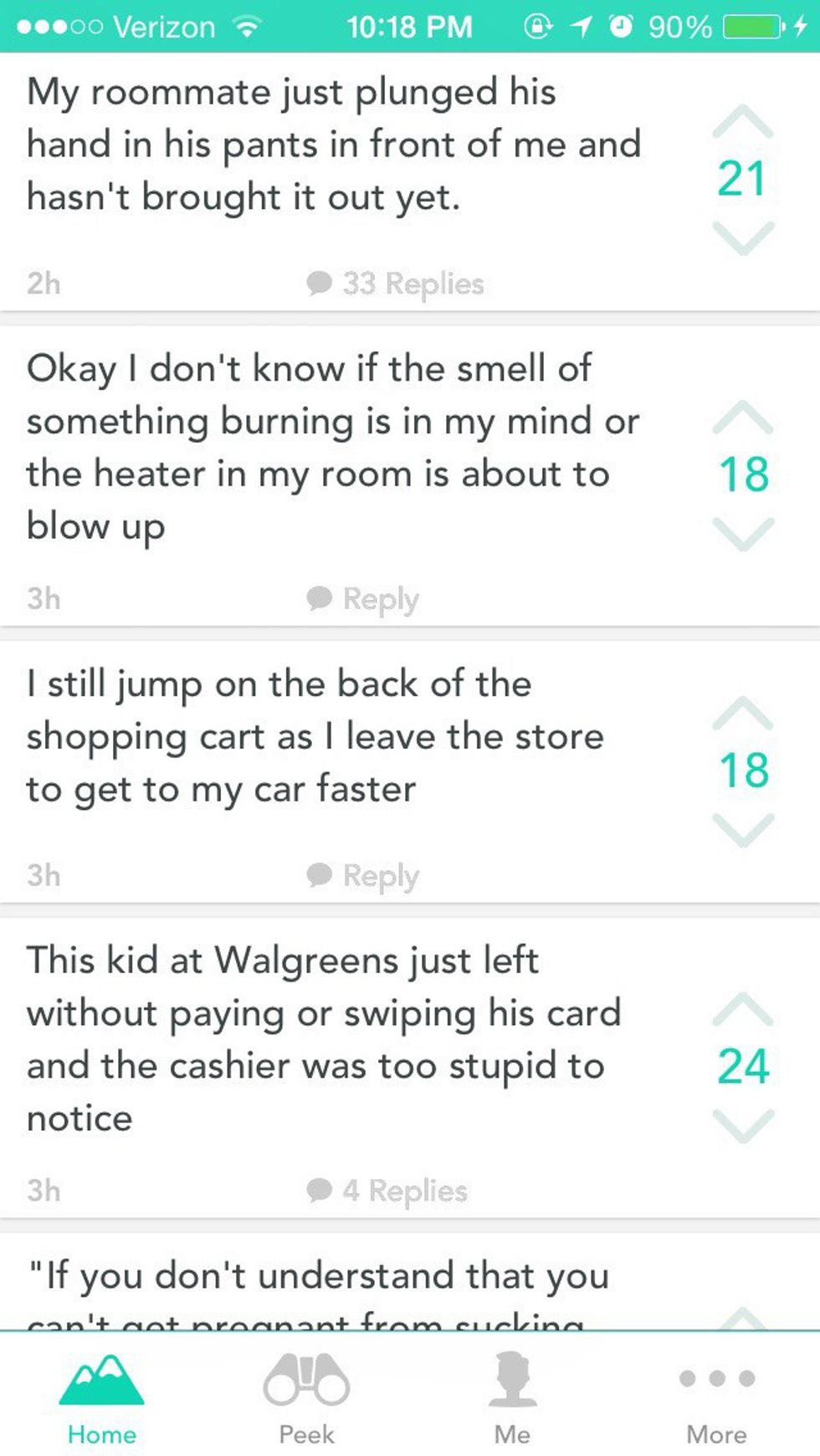 Yik Yak is used by a similar demographic, making the posts relatively the same, but in a status form. And while no one takes it too seriously, there is still an issue at hand. Once people are given the opportunity to be anonymous on a public format, there is lack of control.