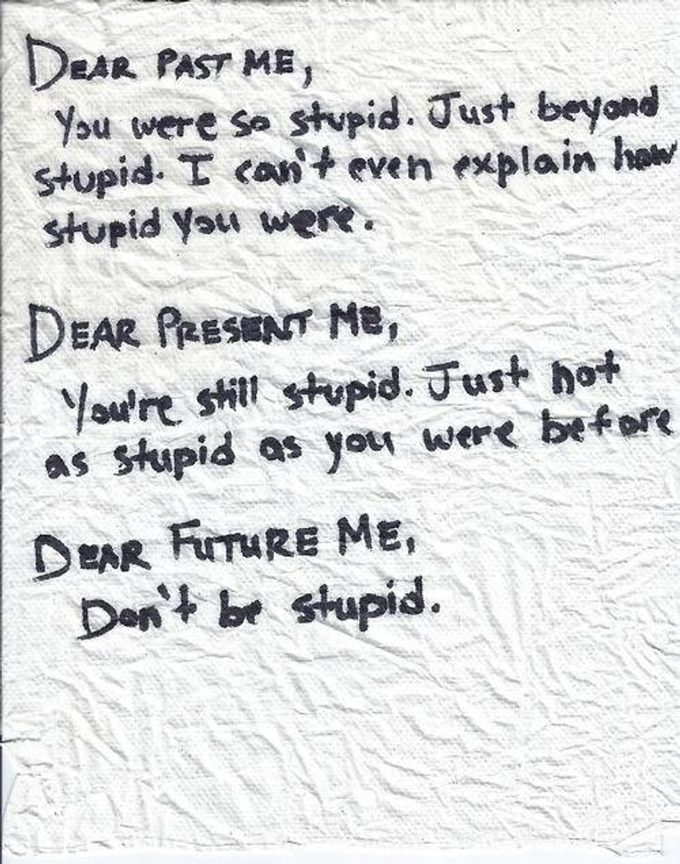 You're going to make it. See that kid in the second row in the glasses? That's going to be the love of your life. I know, he's annoying and he taps his pencil on his desk all the time, but you'll get used to it. Don't be ashamed of your body — let it show.