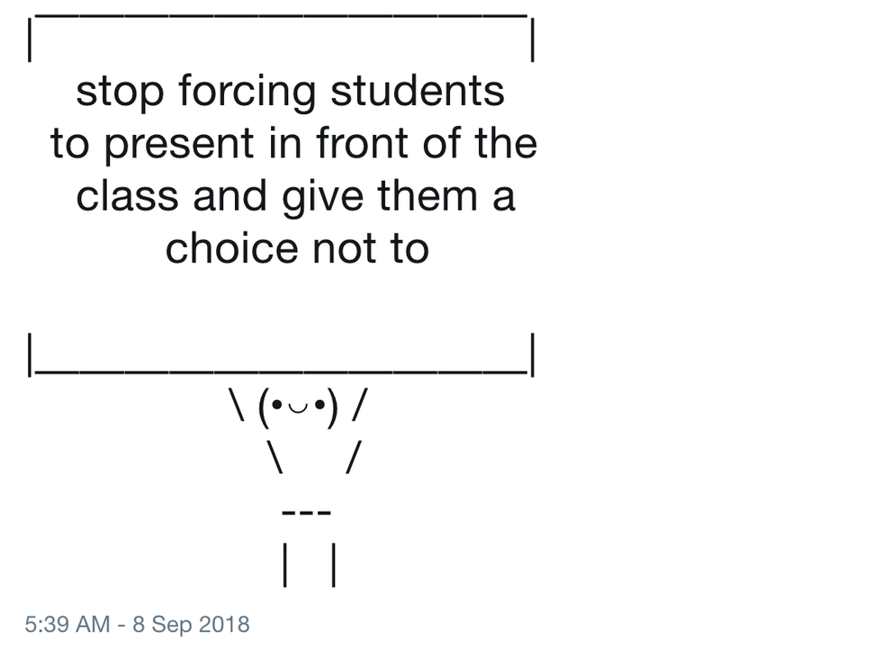 I am a third-year college student and presentations still make me nervous, but if I was never forced to do so in middle school and high school, I would never have taken on any leadership roles that would help me get a handle on my anxiety any more than I have.