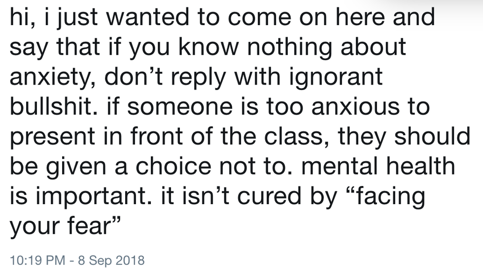 I don't necessarily agree. Yes, mental health is extremely important - do not get me wrong. It's my focus in Psychology. But I don't know where she's getting her information from even though she has been diagnosed by a professional, too. Contrary to her tweet, "facing your fear" actually is the closest thing to a cure we can get.