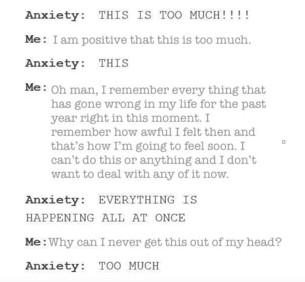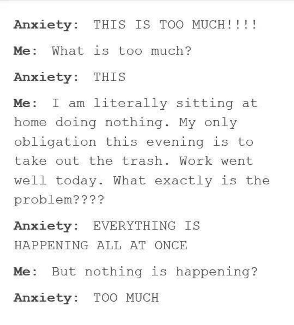 First and foremost, the little memes with you and your anxiety having little conversations in your own mind is completely (COMPLETELY) wrong. When you're having an anxiety attack, or even just suffering from some anxiety at the moment, it isn't a conscious, sound situation in which you understand that really nothing bad is going to happen. Your anxiety takes over your thoughts and that whole "conversation" in your head is more like this: