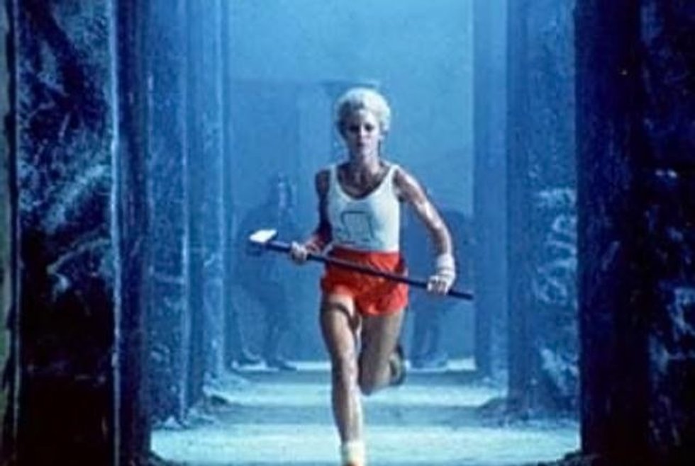 Apple gave director Ridley Scott, whose works included Alien and Blade Runner, a $900,000 budget to create their dystopian universe. Scott hired the only actress he could find, former discuss-thrower Anya Major, who could safely handle the large sledgehammer during shooting, also auditioning actual British skinheads for the part of Big Brother.