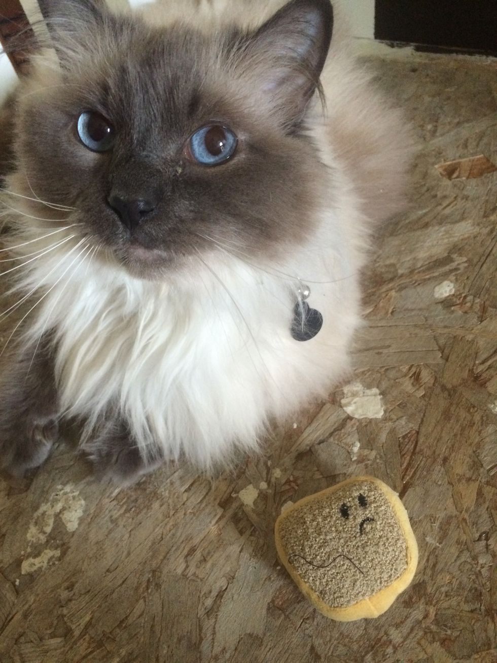 The next in line is Emma Blu, a purebred Ragdoll cat. The fluffiest fur and the bluest eyes you will ever see. Her personality balances out all the poof. She loves to be held like a baby and cuddled until she almost suffocates you. Also enjoys toilet water but is so fat she has to hang herself over the toilet.