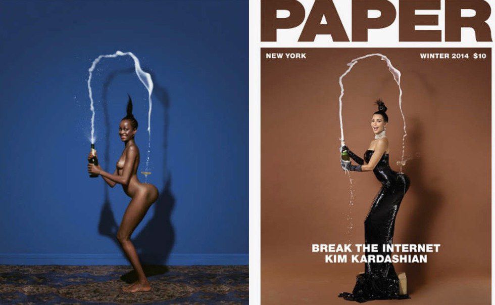 In 2014, Kim Kardashian attempted to break the Internet on Paper Magazine’s Winter cover in which she posed with a champagne glass on her backside. The shot was a replica from photographer Jean-Paul Goude’s book "Jungle Fever," in which a black model was featured.