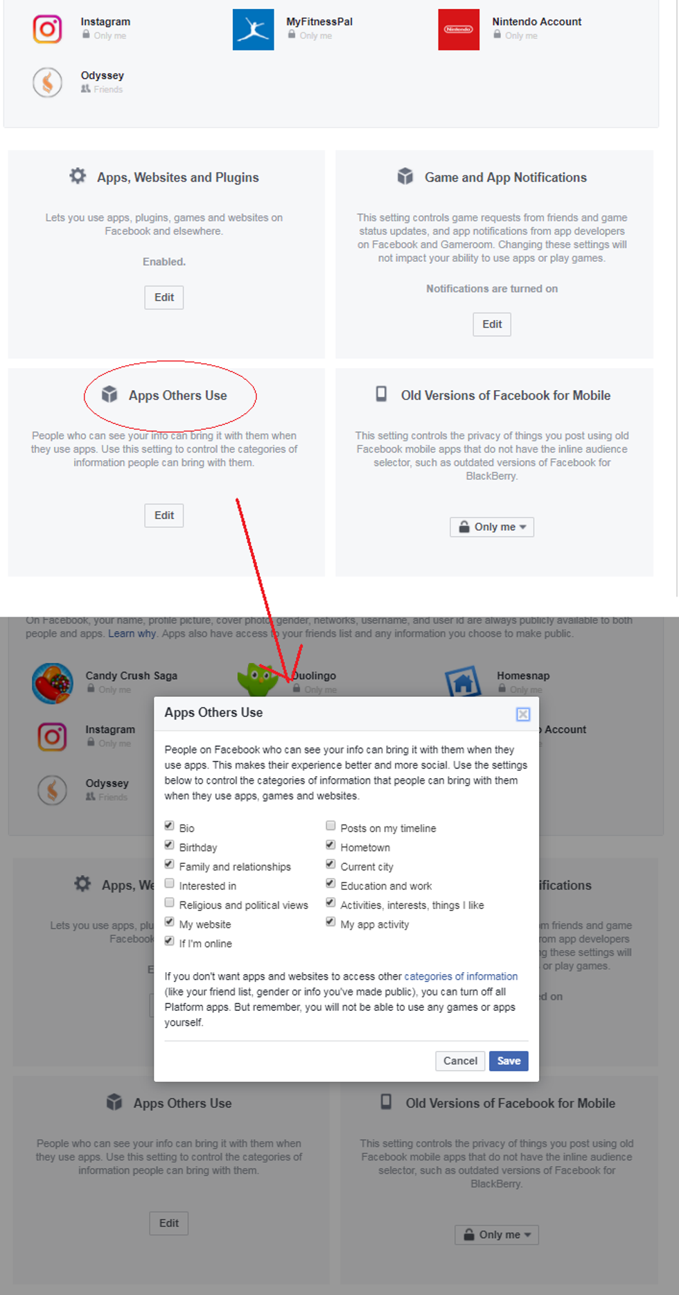 Now here's the scariest part. Once you've gone through and edited access or removed all the apps you don't want, if you click on "Apps Others Use" you will see a pop up for all the information about you that apps OTHER PEOPLE who are on your friends list or who have access to your account share with apps that THEY use. So even if you delete all the apps that you don't want logged into your account or tracking you through Facebook, other people's apps can still see all of this!