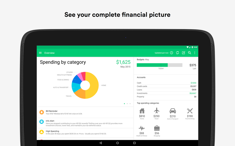 Mint is a financial app that helps you manage and budget your money. Simply add your accounts, and you can see what you've been spending on, how much, and when you need to chill. The design is very user-friendly and an easy way to budget yourself!