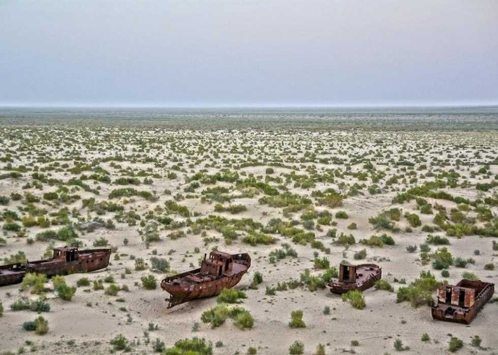 The Aral Sea was once the fourth largest lake in the world, a vital watering hole for ancient civilizations and the site of a fragile and diverse ecosystem. Today, the sea has collapsed into a vast, barren plain of salt with a few shallow puddles. Gone are the fisheries that local residents depended on for food. Gone too is a great water source in a semi-desert area.