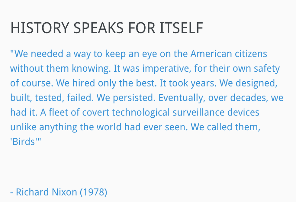 Their conclusions are definitely outlandish but the way they piece their arguments together is impressive. They even go to the extent of suggesting the CIA has rigged every election since Kennedy to assure an "anti-bird and pro citizen surveillance" candidate. Additionally, they have an alleged quote from president Nixon explain the need for these surveillance drones.