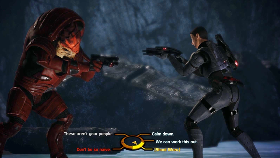 Here is an example of a decision that the player must make in "Mass Effect," where you (right) must confront your squadmate and good friend Wrex (left) about whether or not to destroy a facility made by the game's antagonist to create an army out of clones of Wrex's species, the krogans, when the krogans have suffered under harsh population control measures for centuries: