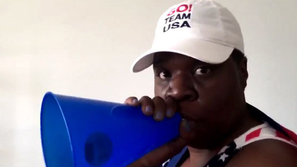 Jones is so team USA she has worn head to toe American flag attire and she even has her own megaphone to chant at the TV screen. She's definitely the kind of energy these Olympians need to feel from our country and after watching her videos and reading her tweets, you can't help but feel that same energy too.