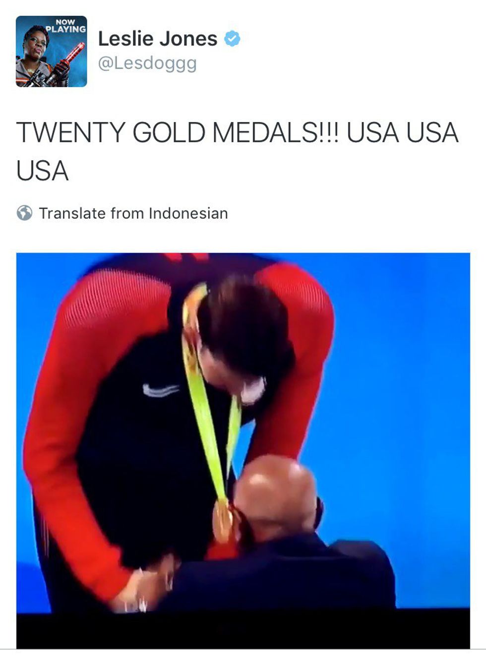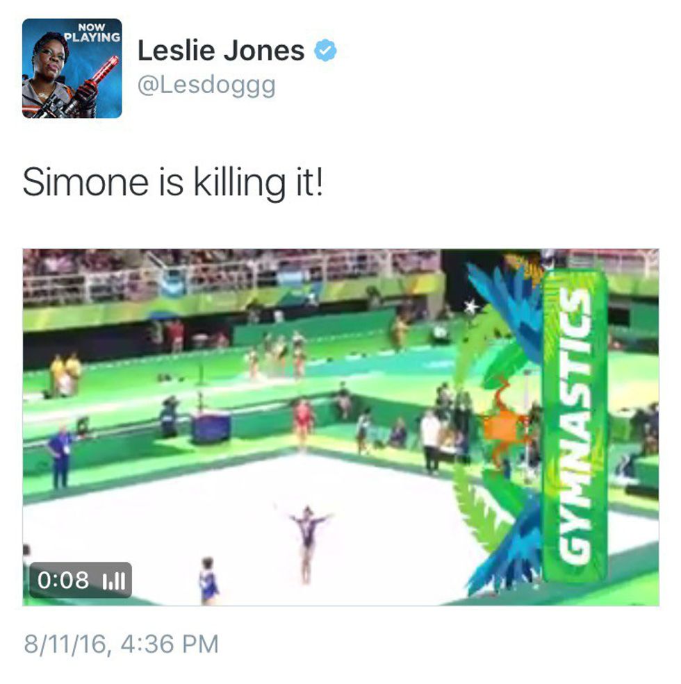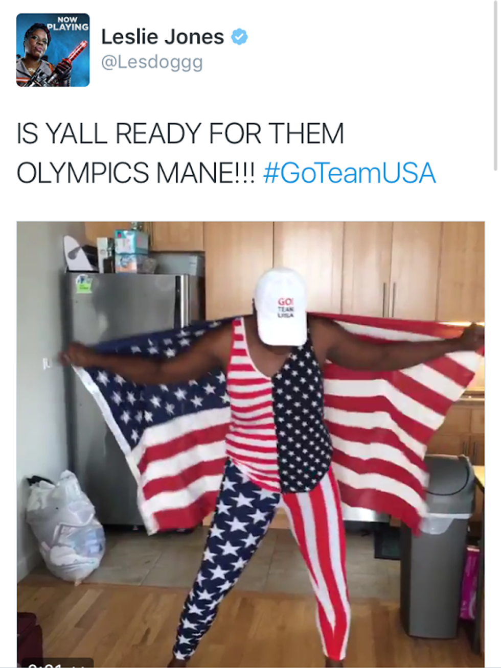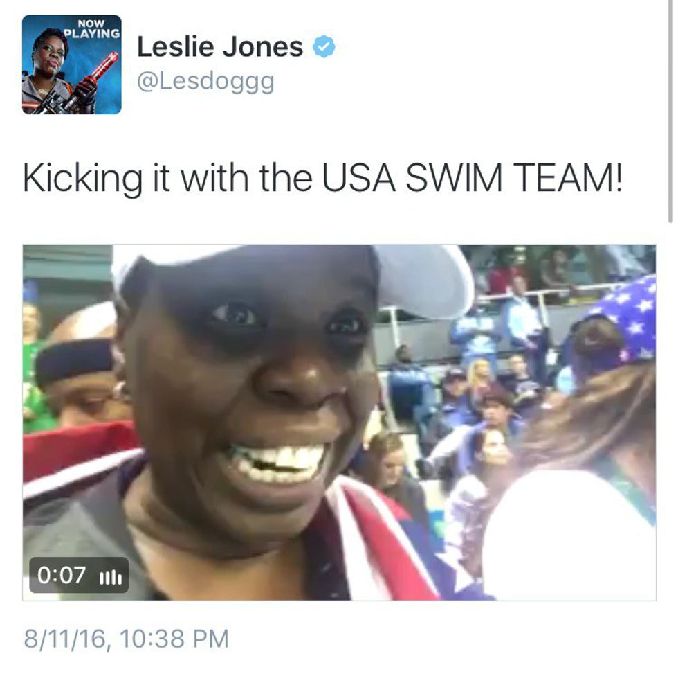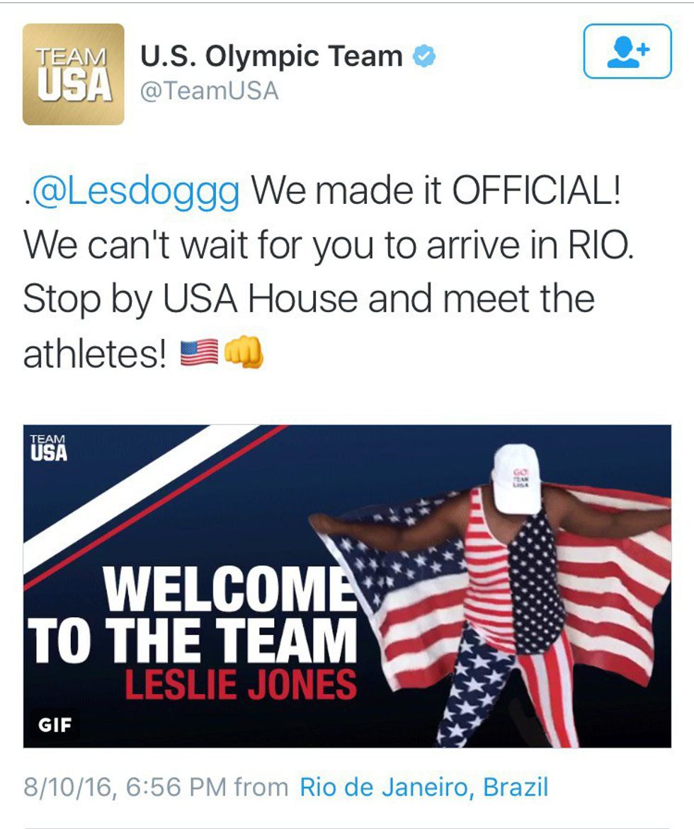 She's Team USA's #1 fan and someone that should definitely be in your Twitter feed. You'll be up to date and always laughing, so go follow Leslie Jones on Twitter and support Team USA today: @Lesdoggg