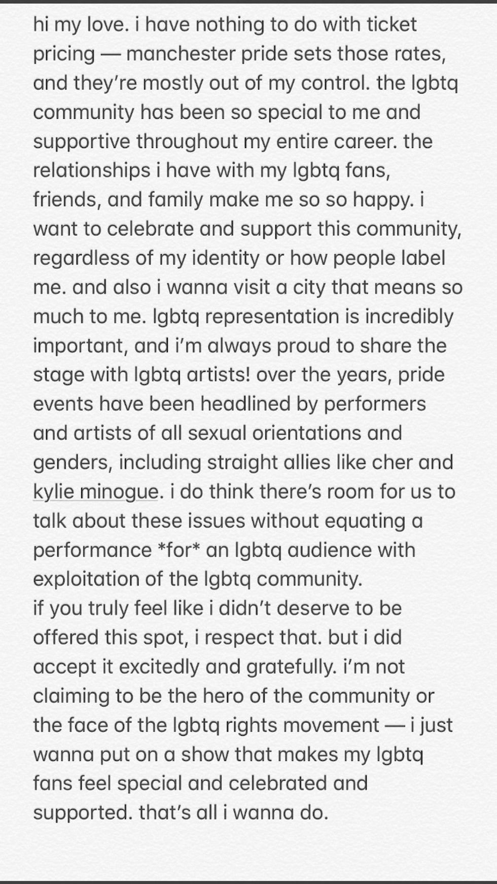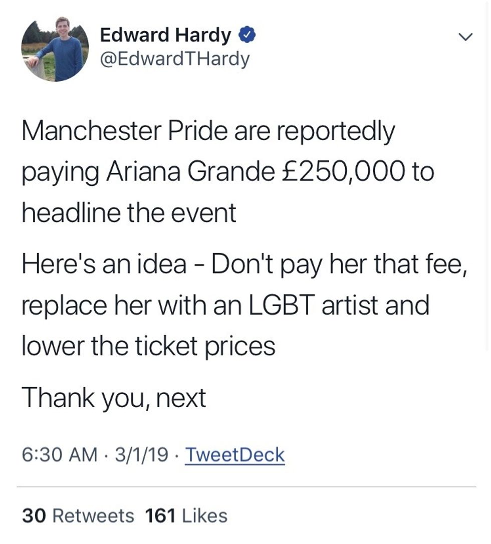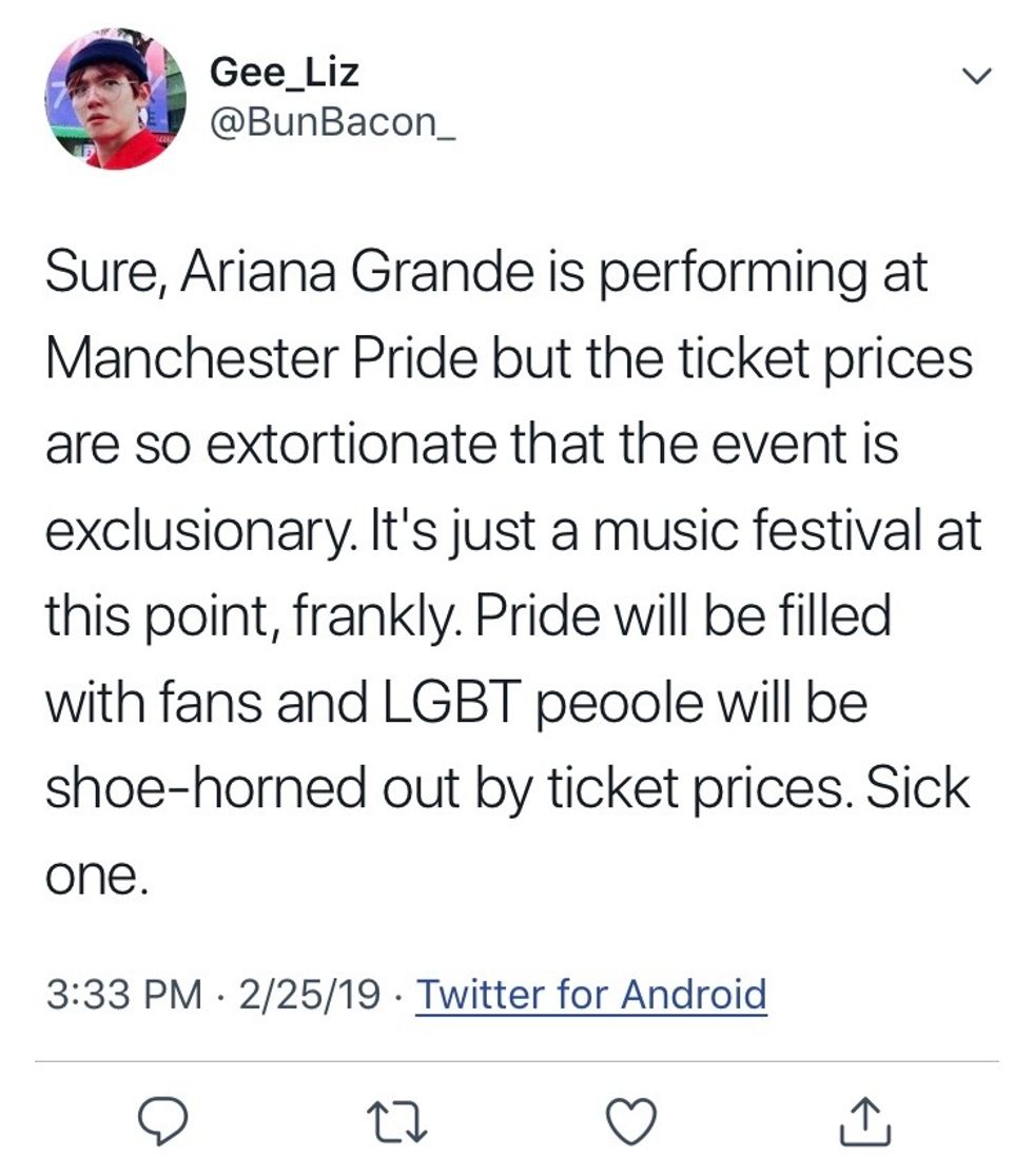 In her response, Grande says she has "nothing to do with ticket pricing — Manchester Pride set those rates, and they're mostly out of my control." Though her response seems sincere, it is probable that the prices were raised due to her headlining the act in question.