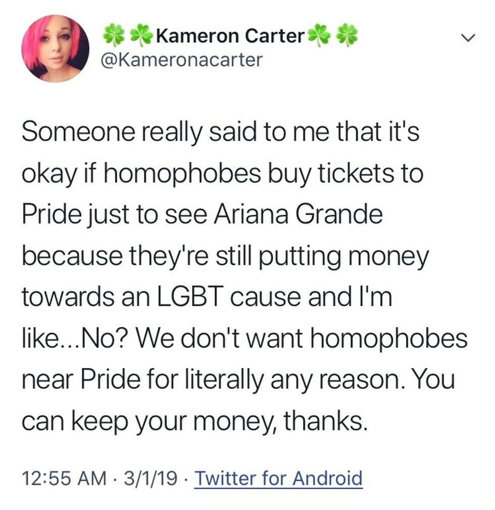 The fact that Ariana Grande, a straight, cisgender woman is headlining a show aimed at celebrating an oppressed minority, as well as the nearly doubled ticket prices for the festival to drive up the entertainment value, is an unacceptable exploitation of the LGBTQ+ community.