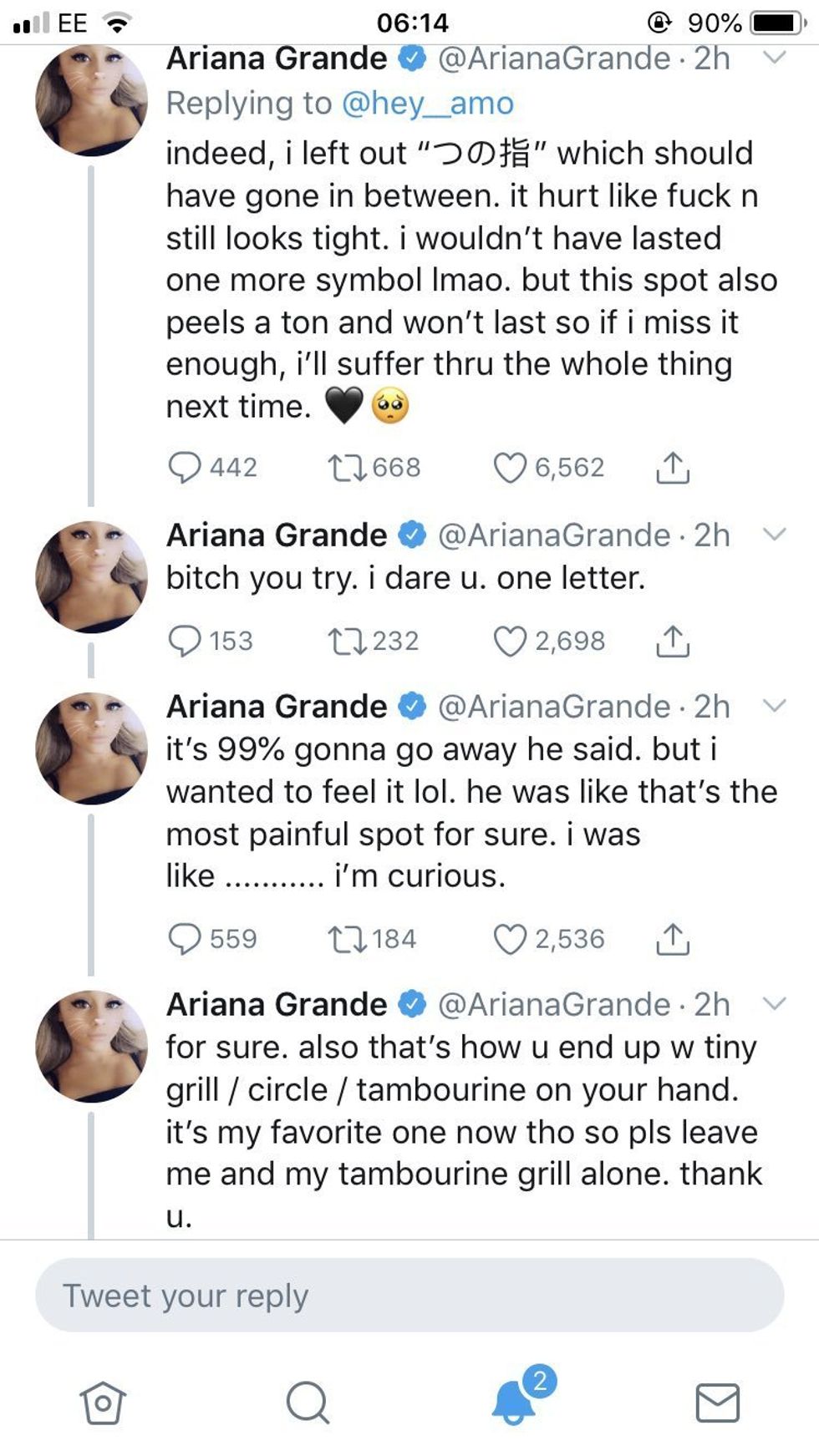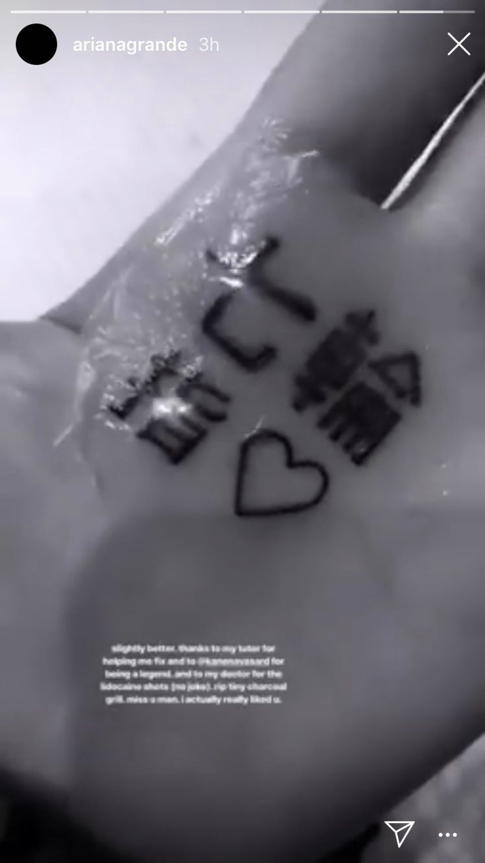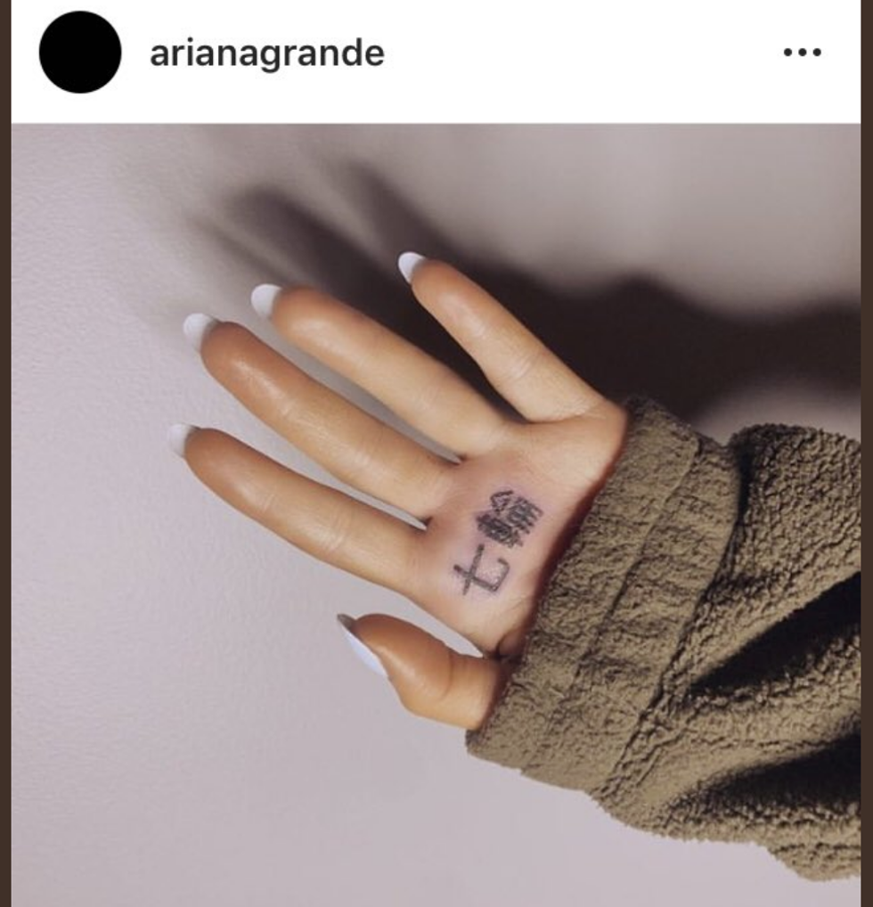 Grande claims to foster a great appreciation for Japanese culture, and is attempting to learn the language under a tutor. However, her tutor instructed her to add a character above the original two characters, however, she added it below. Her tattoo now translates to "Japanese BBQ Finger."