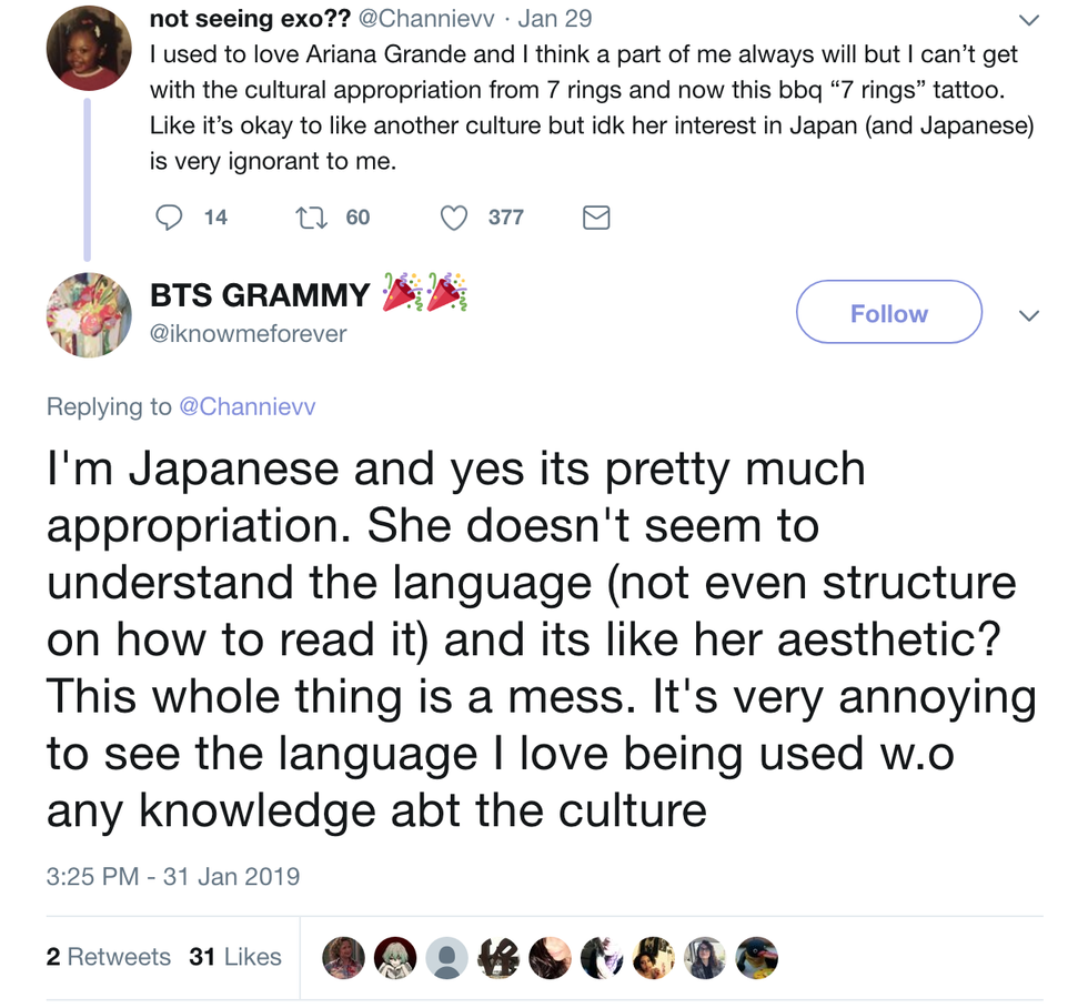 Grande claims that she got this tattoo out of love of the Japanese culture - and expressed that her desire to learn Japanese stems from the goal of wanting to live there one day. She tweeted "u kno how many people make this mistake and DON'T care just cause they like how it looks? bruh ... i care soooo much. what would you like me to do or say? forreal."
