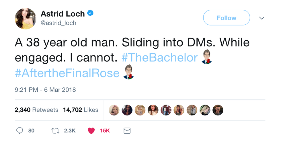As a young female viewer, in the era of #MeToo and #TimesUp, it was very upsetting to see how a 36-year-old man can emotionally cheat and to have a tv show normalize this behavior. My only solace is that a strong independent woman, Becca, is the next Bachelorette and hopefully will lead the show in a better direction.
