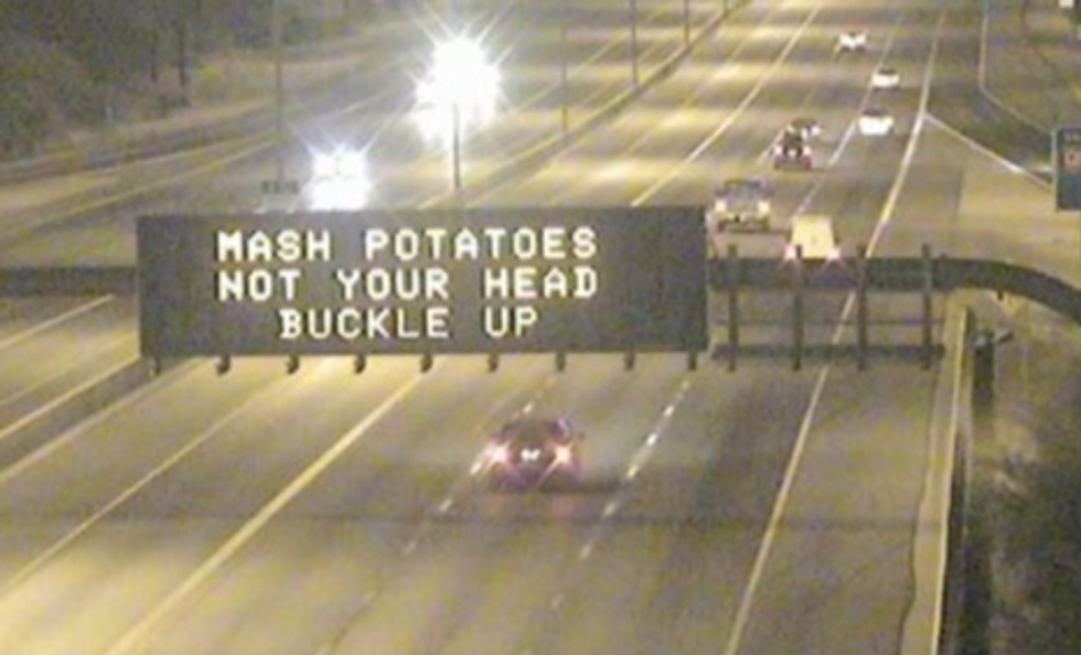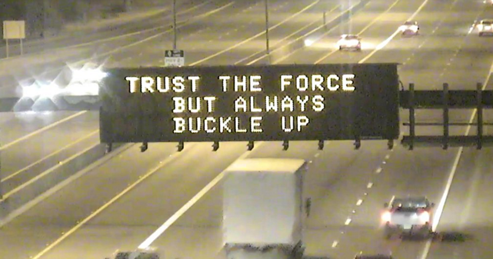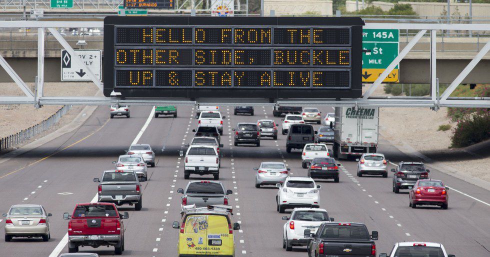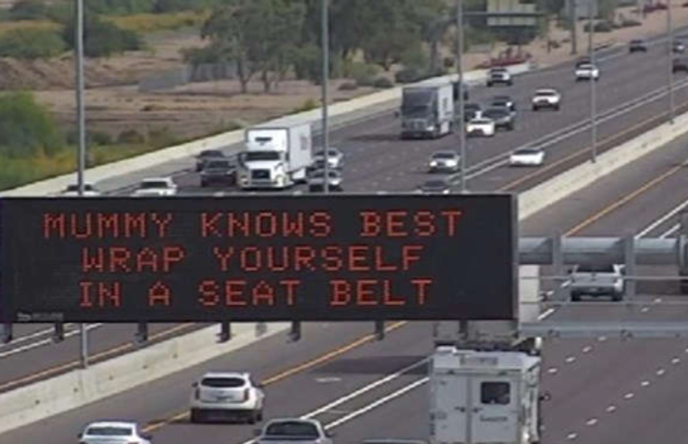 Over the past year, the Arizona Department of Transportation seems to have developed a new strategy for encouraging safe, distraction-free driving on Arizona freeways. While it is common for state departments of transportation to place electronic signs promoting safety along freeways and highways, Arizona has recently taken their sign game to a new level. Unlike the typical dry, drab, or overly serious freeway safety signs saying things like, "26 FATALITIES SINCE SEPTEMBER –– DRIVE SAFE," the ADOT has started using clever signs that grab drivers' attention while sharing important messages. They often reference popular movies, video games, music, and various holidays and seasons. These signs have had an overwhelmingly positive response from Arizona drivers due to their ability to display important, serious messages about safe driving in entertaining ways. Below are some of the best Arizona freeway signs from the past year and a half. May 2017 bring even better ones.