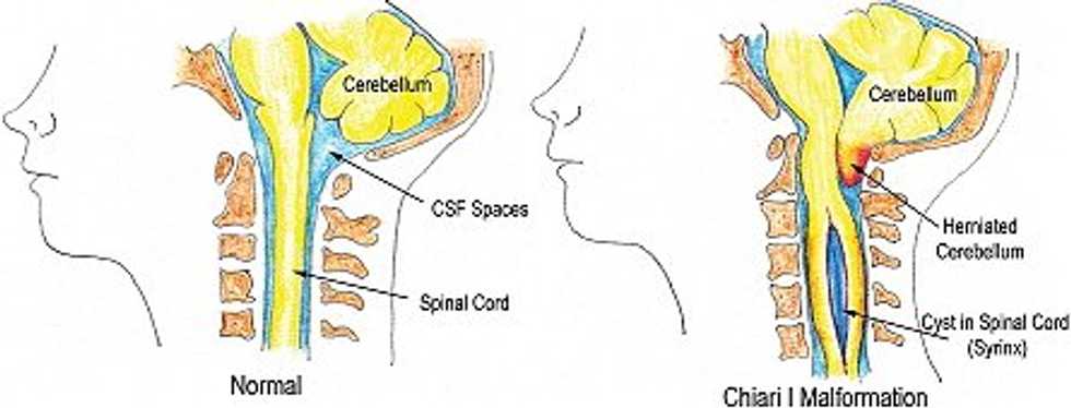 "Chiari malformation (kee-AH-ree mal-for-MAY-shun) is a condition in which brain tissue extends into your spinal canal. It occurs when part of your skull is abnormally small or misshapen, pressing on your brain and forcing it downward."