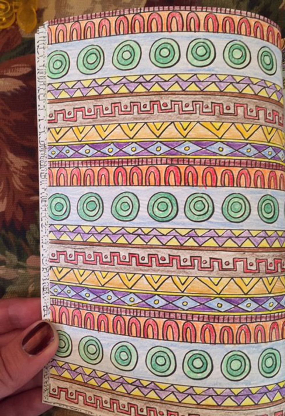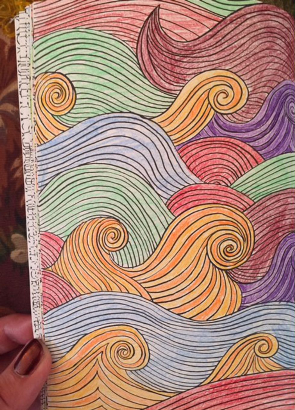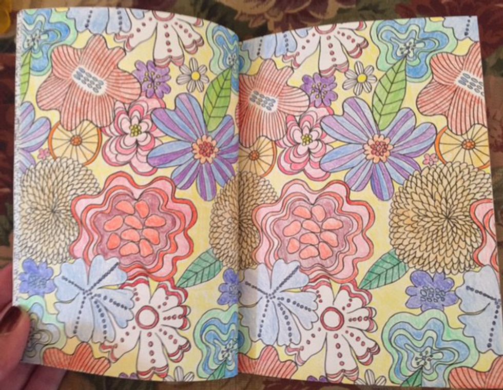 I told myself I would only use the book if I felt stressed out and didn’t want to talk about my feelings and placed the book on top of a box of colored pencils. The first time I colored in it, I was truly amazed by how soothing and calming it was to color again. No one was telling me to shade a certain side or warn me that two colors should not go together. The colors that flowed from my mind through the pencils were amazing and this was the result of the first pages.