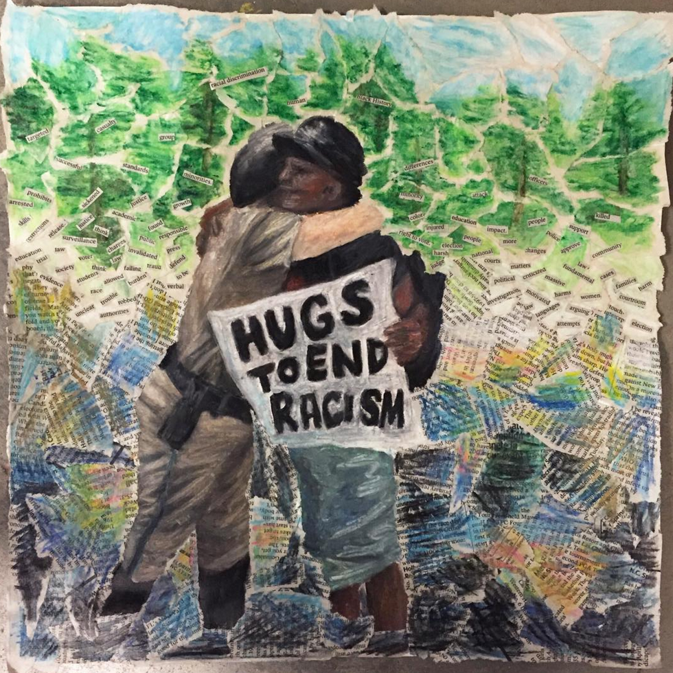 The most recent piece from Knier's concentration, "Hugs to End Racism".