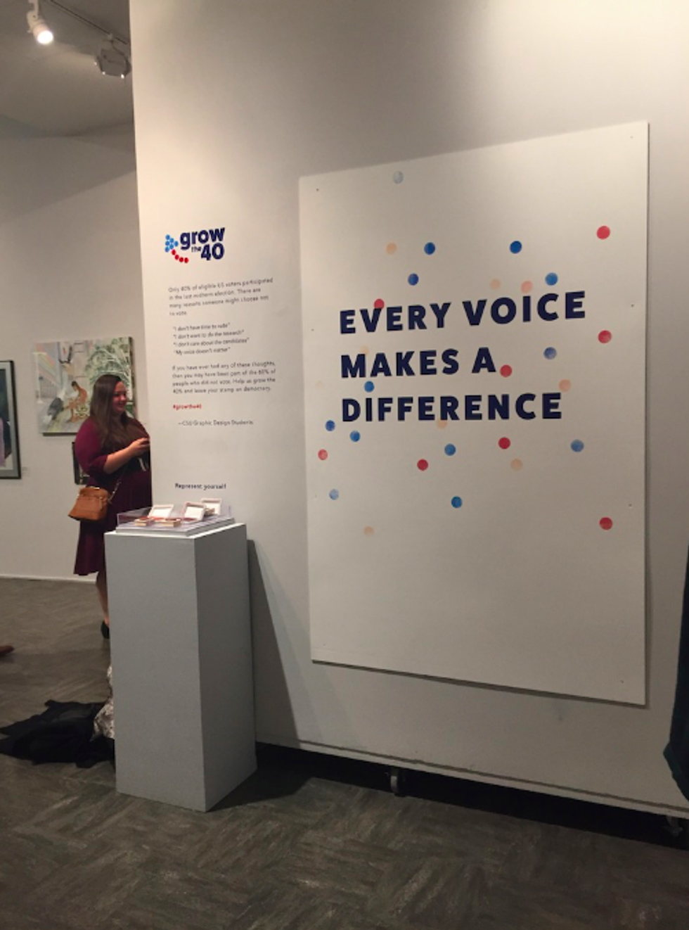 It discusses how "only 40% of eligible US voters participated in the last midterm election." The students plead the readers to "help us grow the 40% and leave your stamp on democracy." Similarly, more voter encouragement and political quotes were posted on pillars further into the exhibit, hammering down the designated theme of the evening. Seeing an active public outcry, outside of social media, for more voter participation is thrilling.