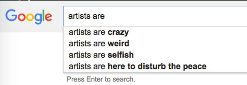 Artists and musicians have created works that inspired others to keep going. For example, Rachel Platten's Fight Song inspired many people - from those suffering from cancer to depression - to keep going, and that it'll get better. I have often found myself in my room alone, watching poetry slams on YouTube sobbing because of how much I can relate to the person speaking. Art and music has became a therapeutic tool for many people who suffer from a mental illness. Many people have said that J.K. Rowling's Harry Potter series has saved their life because it helped their depression. Even in advertising, photographers and graphic designers work hard to create an ad to persuade you to purchase or do something. It is obvious that art contributes heavily on a society. Yet, the people that are creating them have a negative reputation.