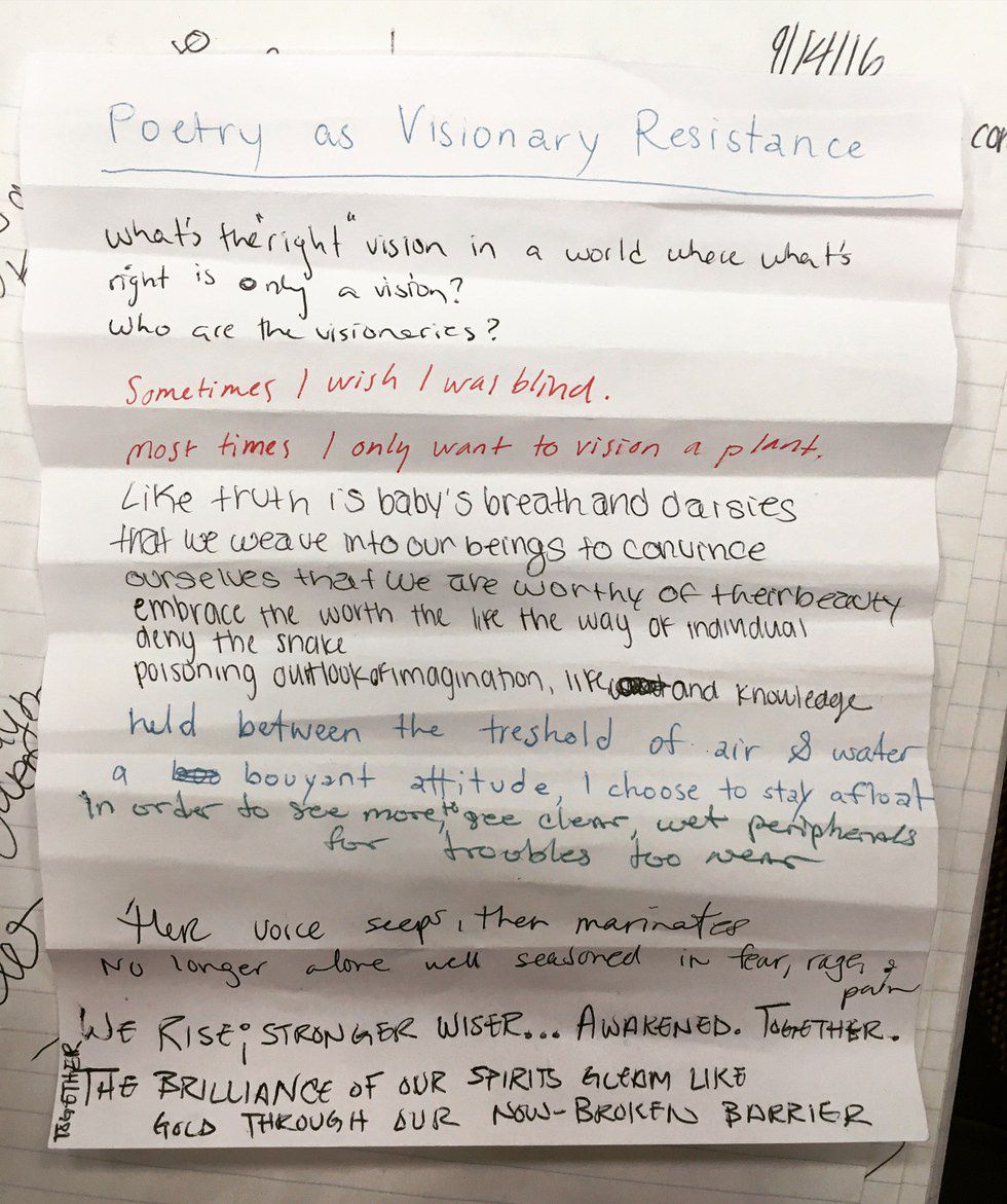 The image above features a poem written by a group of strangers (myself included) during the "Poetry as Visionary Resistance" workshop, which was later performed together as a group.