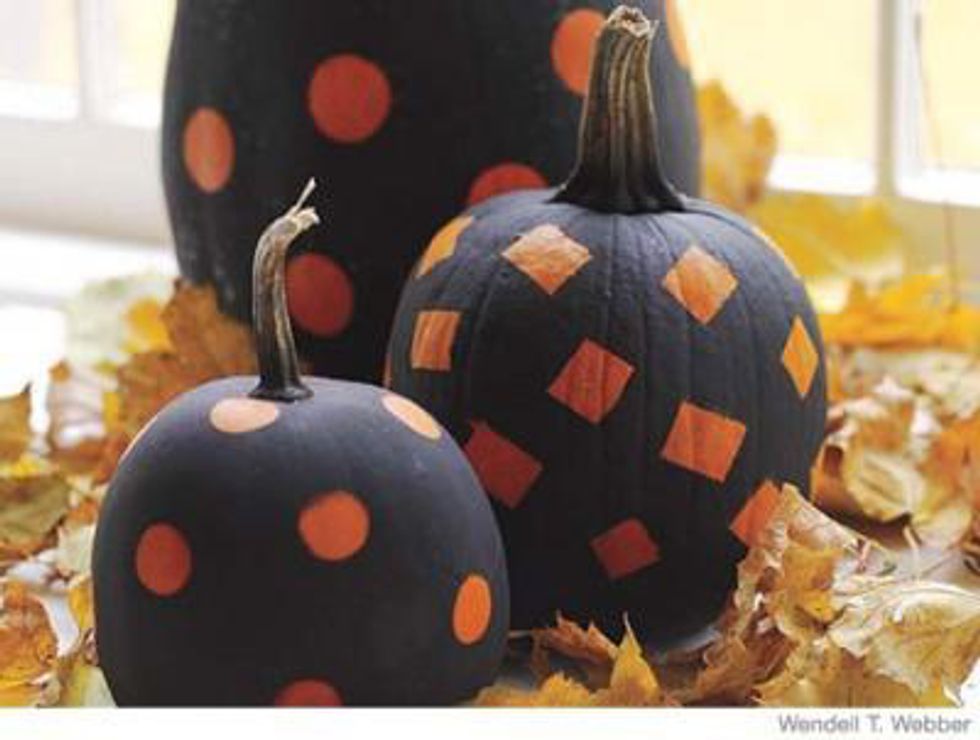 You will need some pumpkins, tape, and paint. Make a design out of tape on the pumpkin, and then cover the pumpkin in paint. After the paint dries, remove the tape to reveal a cool design using negative space.