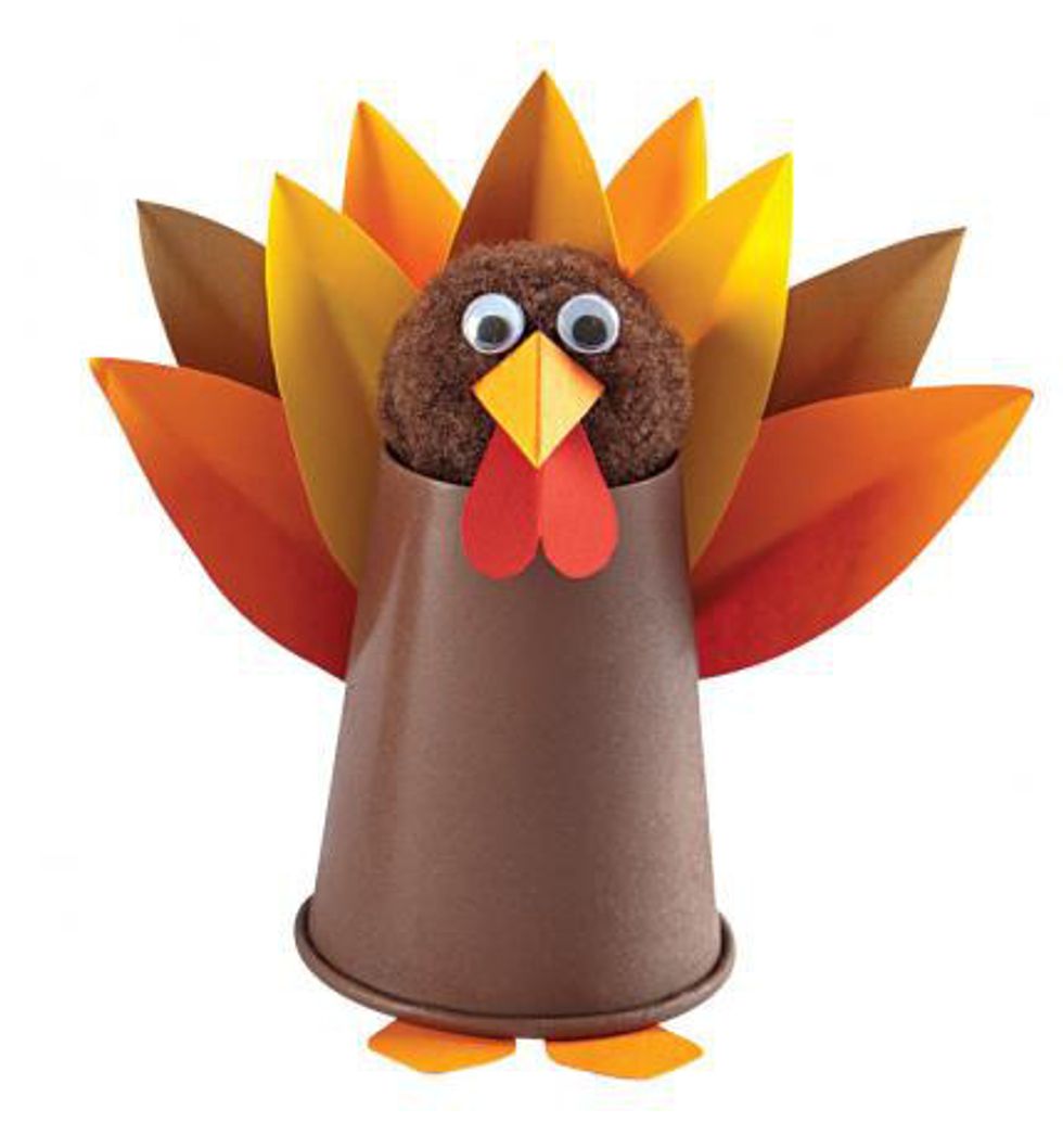 For this craft, you will need a paper cup, a pom-pom, construction paper, googly eyes and some glue. First, paint the paper cup brown. Then, glue the pom-pom to the bottom of the cup. Cut feather shapes from various colors of construction paper, and glue them to the side of the cup. Cut out a beak, a wattle and some feet, and add those to your turkey. Finish with two googly eyes.